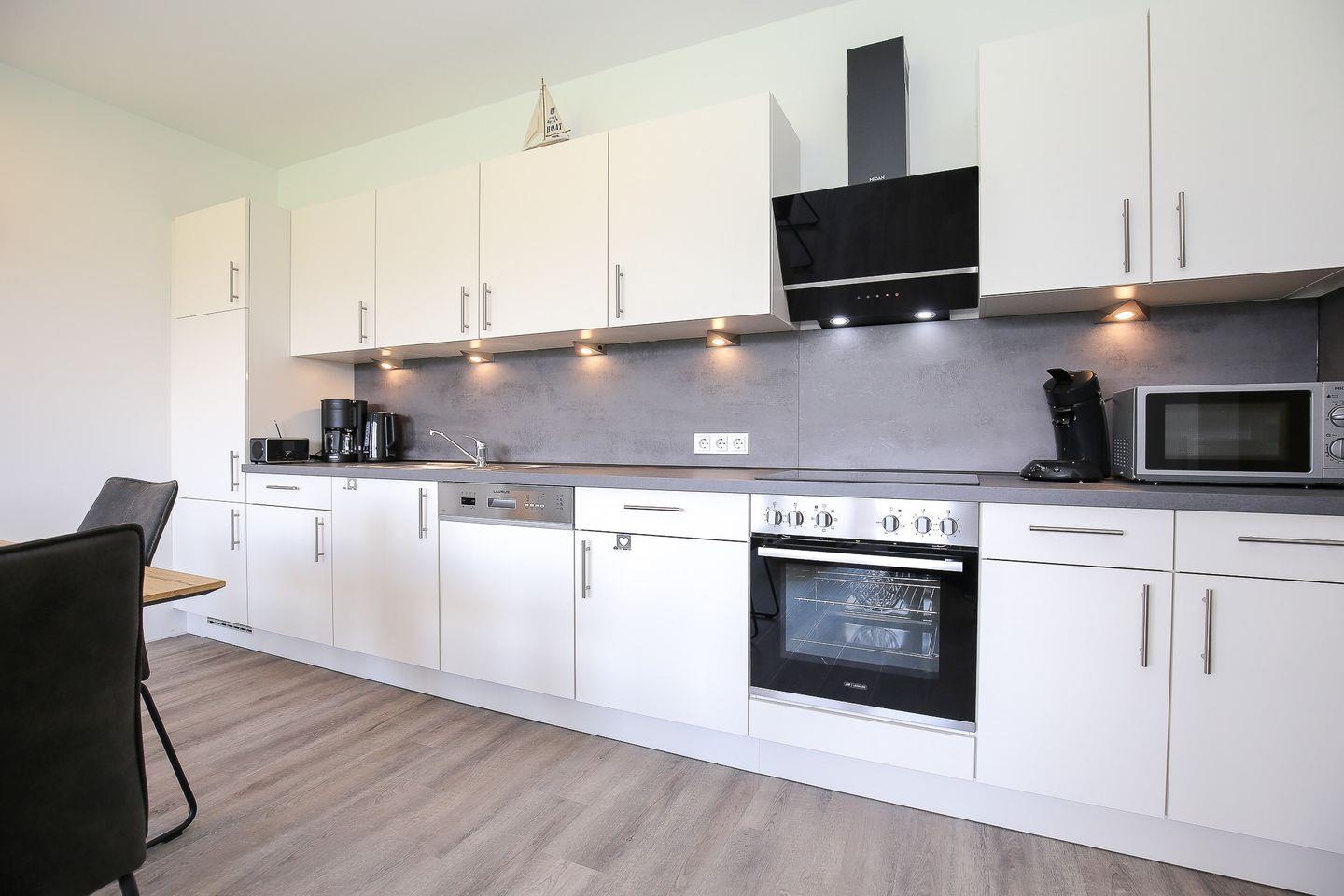 Die im Wohnzimmer integrierte Küche lässt keine Wünsche offen. Zur Zubereitung deiner Mahlzeiten ist alles vorhanden, was du benötigst. Dazu zählen ein Herd mit einem 4-Platten-Cerankochfeld sowie einem Backofen, ein Kühlschrank mit Gefrierfach, eine Geschirrspülmaschine, ausreichend Geschirr, Besteck und Gläser.