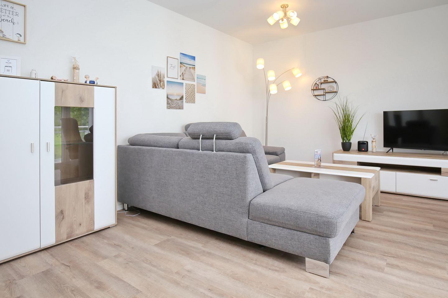 Das Wohnzimmer lädt zum Entspannen ein. Große Fensterfronten bieten dir ein großzügiges Wohngefühl. Im Wohnzimmer ist einem gemütlichen Ecksofa, ein Relax-Sessel und selbstverständlich ein Flachbildfernseher mit Magenta TV vorhanden. Vom Wohnzimmer aus gelangst du auf den möblierten Balkon, der nach Westen ausgerichtet ist. Weiterhin ist ein Radio mit einem Bluetooth-Lautsprecher vorhanden.