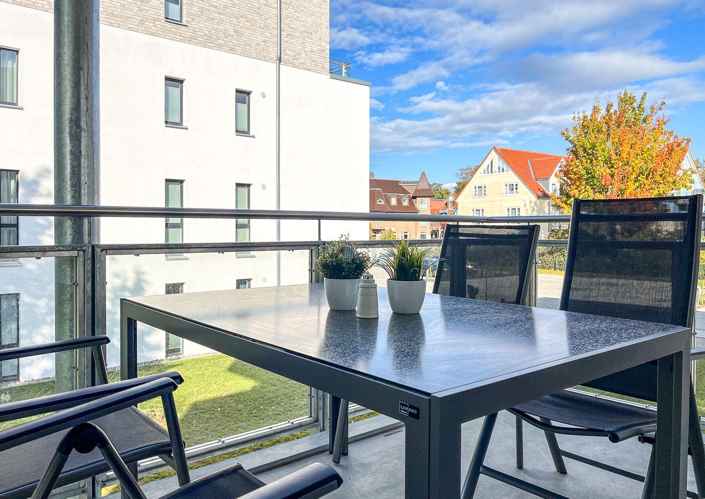 Die 4-Zimmer-Wohnung im Haus 2 der Weißen Villen ist ca. 87 m² groß und bietet Platz für bis zu 6 Personen (4 Erwachsene + 2 Kinder). Die Ferienwohnung befindet sich im 1. Obergeschoss, der Balkon ist westlich ausgerichtet. Ein Fahrstuhl sowie WLAN (ohne Gewähr) sind vorhanden.