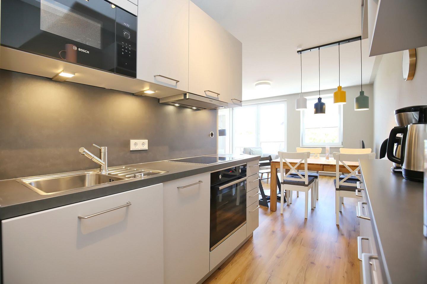 Zur Ausstattung der im Wohnbereich integrierten Küche gehören neben ausreichend Geschirr ein 4-Platten-Induktionsherd mit Backofen, eine Mikrowelle, eine Spülmaschine und ein Kühlschrank mit Gefrierfach.