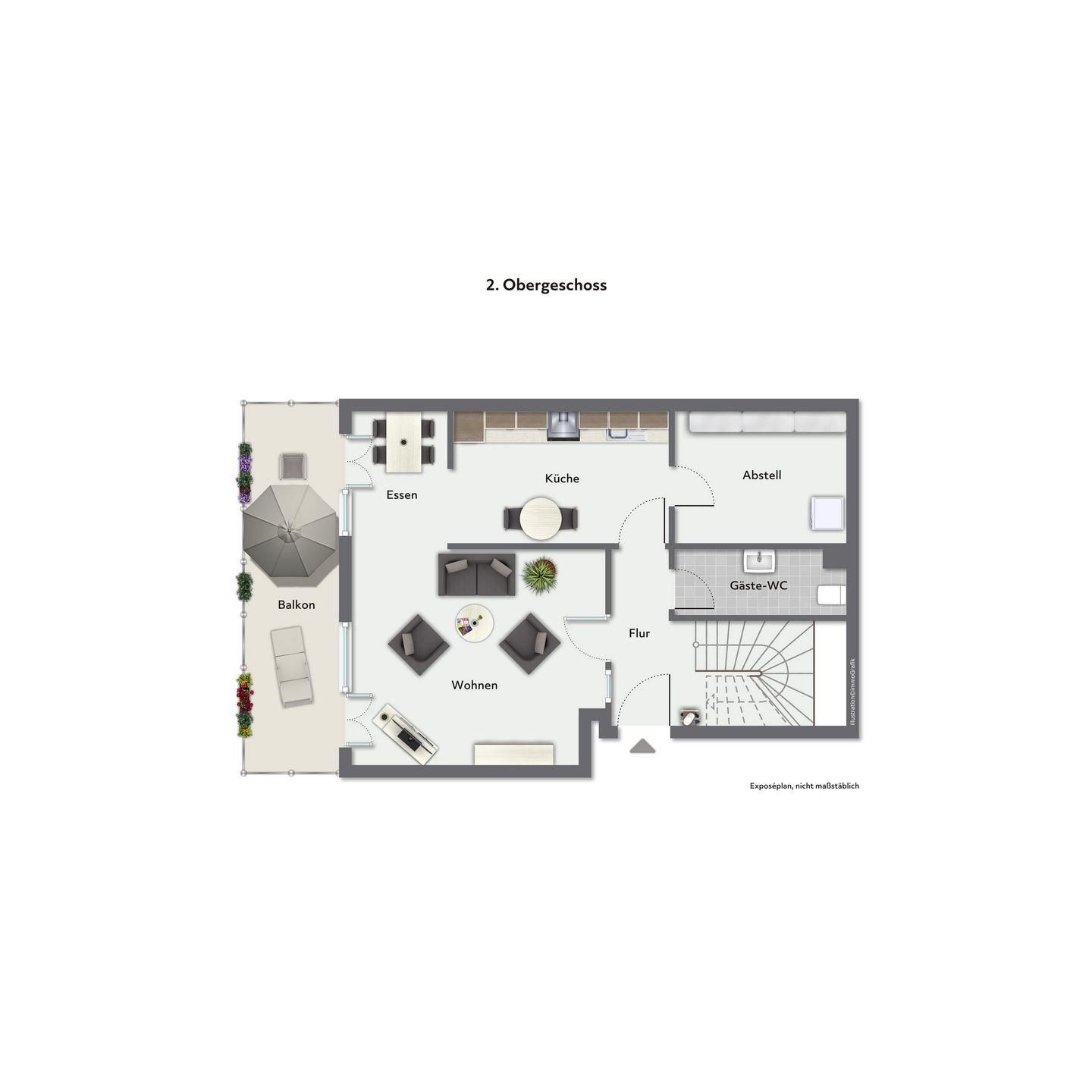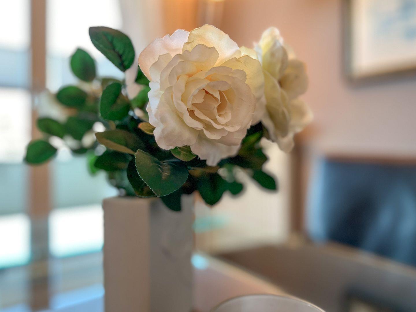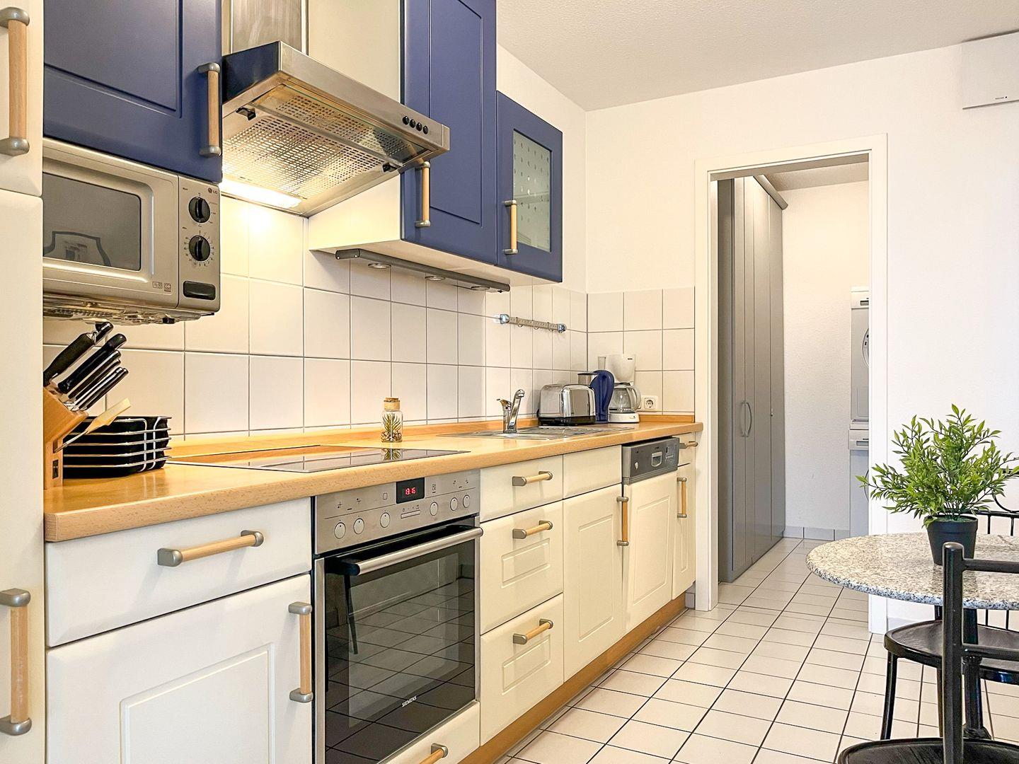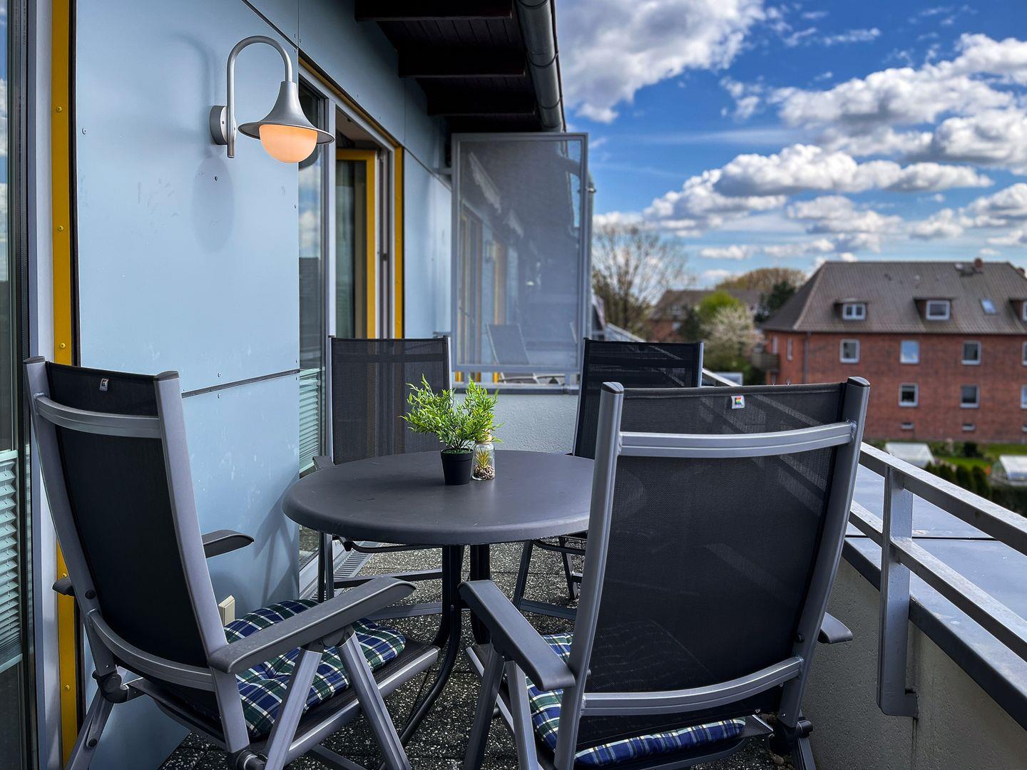 Die Dachterrasse der Ferienwohnung ist möbliert und vom Wohnzimmer aus zu erreichen. Zwei Markisen als Sonnenschutz sind vorhanden. Der Wohn- und Essbereich ist mit Polstermöbeln und einem Essbereich gestaltet. Für Kurzweil sorgt ein Smart-TV mit Audioanlage (Bluetooth-Anschlussmöglichkeit). In der gut ausgestatteten Küche nutzt du den Induktionsherd mit 2x2 variablen Kochbereichen und Backofen sowie eine Mikrowelle für die Zubereitung deiner Mahlzeiten. Selbstverständlich sind ein Kühlschrank mit integriertem Gefrierfach sowie ein Geschirrspüler vorhanden.