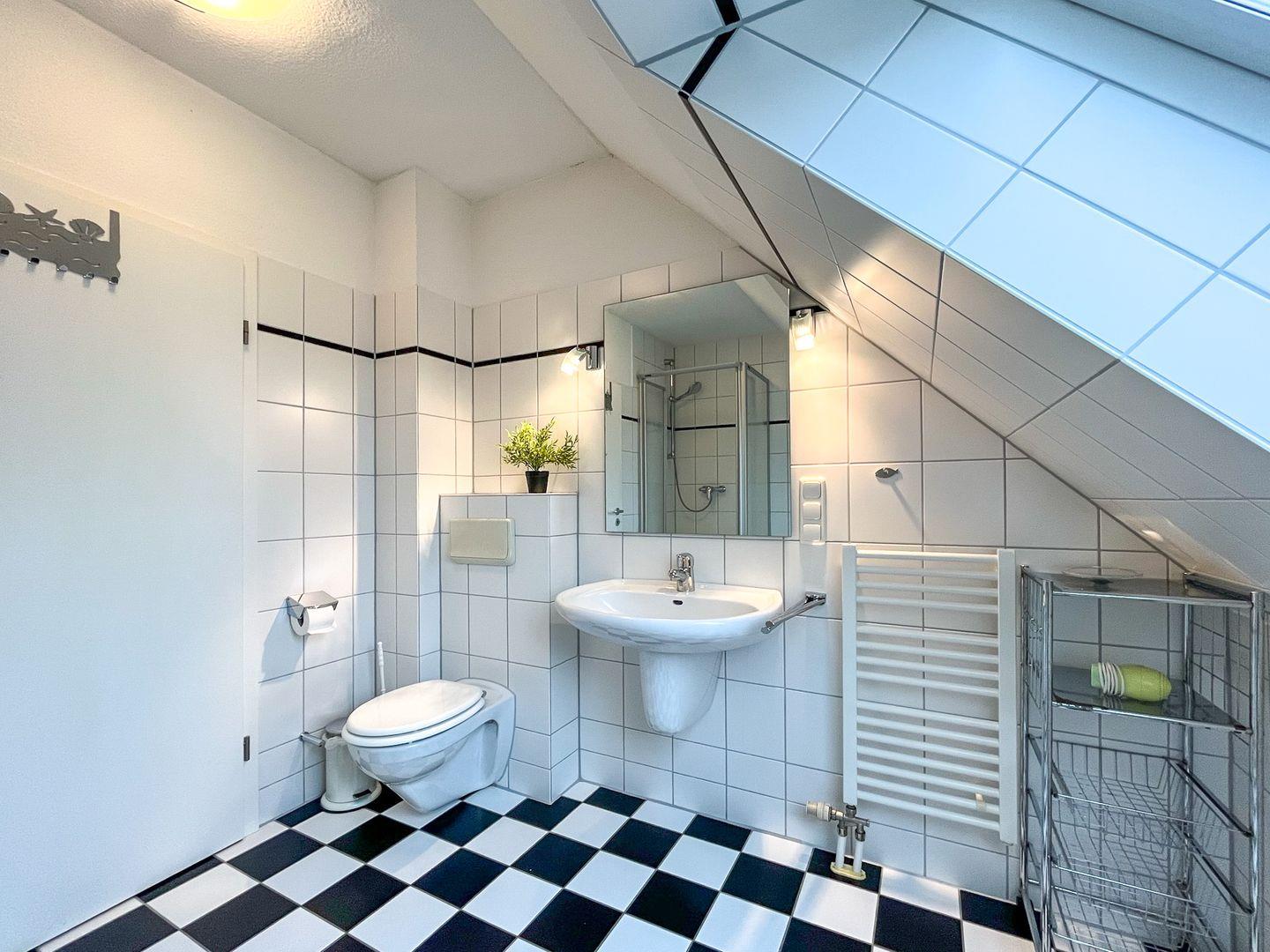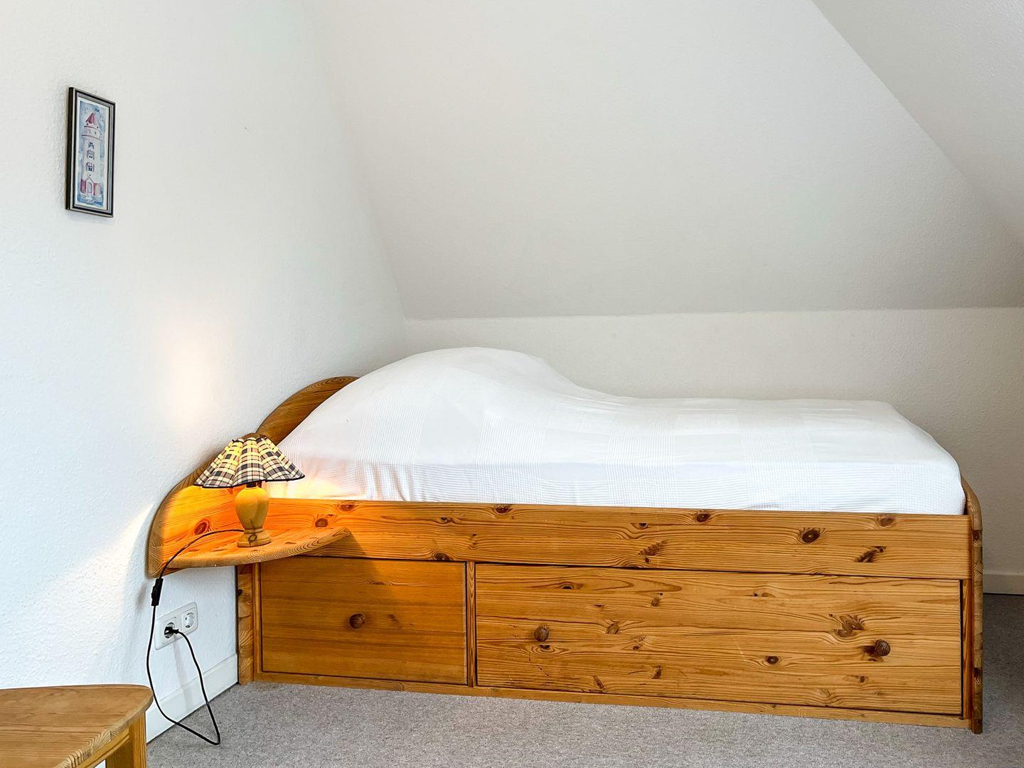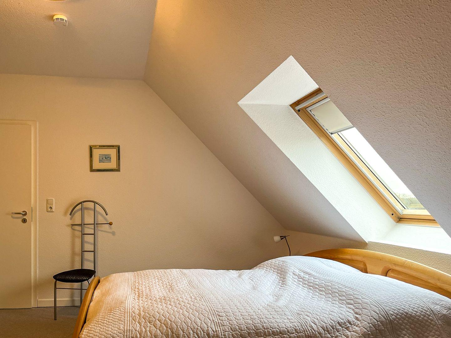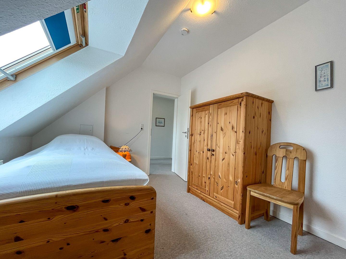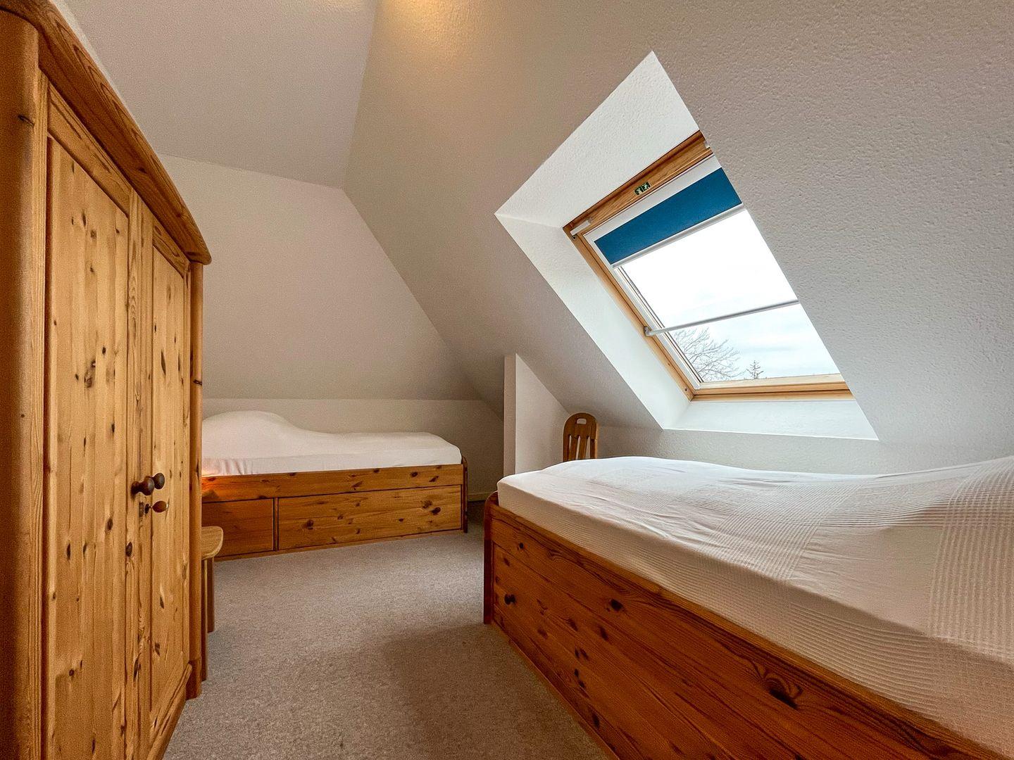 Entspanne nach einem Strandtag im ersten Schlafzimmer in einem Doppelbett (2 x 90 x 200 cm) und im zweiten Schlafraum in zwei Einzelbetten (100 x 200 cm). Platz für deine Urlaubsgarderobe findest du in einem Kleiderschrank und in einer Kommode. An den Fenstern im Schlafzimmer befinden sich dicht schließende Velux-Rollos als Sichtschutz. Im ersten Schlafzimmer findest du einen zusätzlichen Fernseher vor.