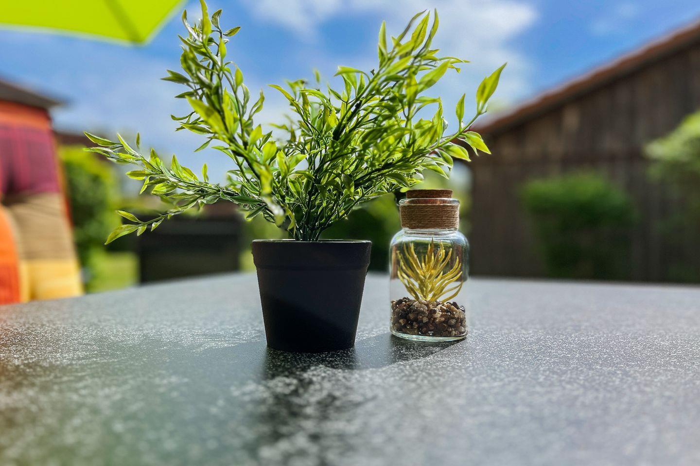 Die im Wohnbereich integrierte Küchenzeile ist ebenfalls gefliest und bietet dir einen Geschirrspüler, eine Mikrowelle, einen Herd mit einem 4-Platten-Cerankochfeld und Backofen sowie einen Kühlschrank. Der gemütliche Essbereich befindet sich in unmittelbarer Nähe. Auch am Fenster befindet sich ein Insektenschutzgitter.