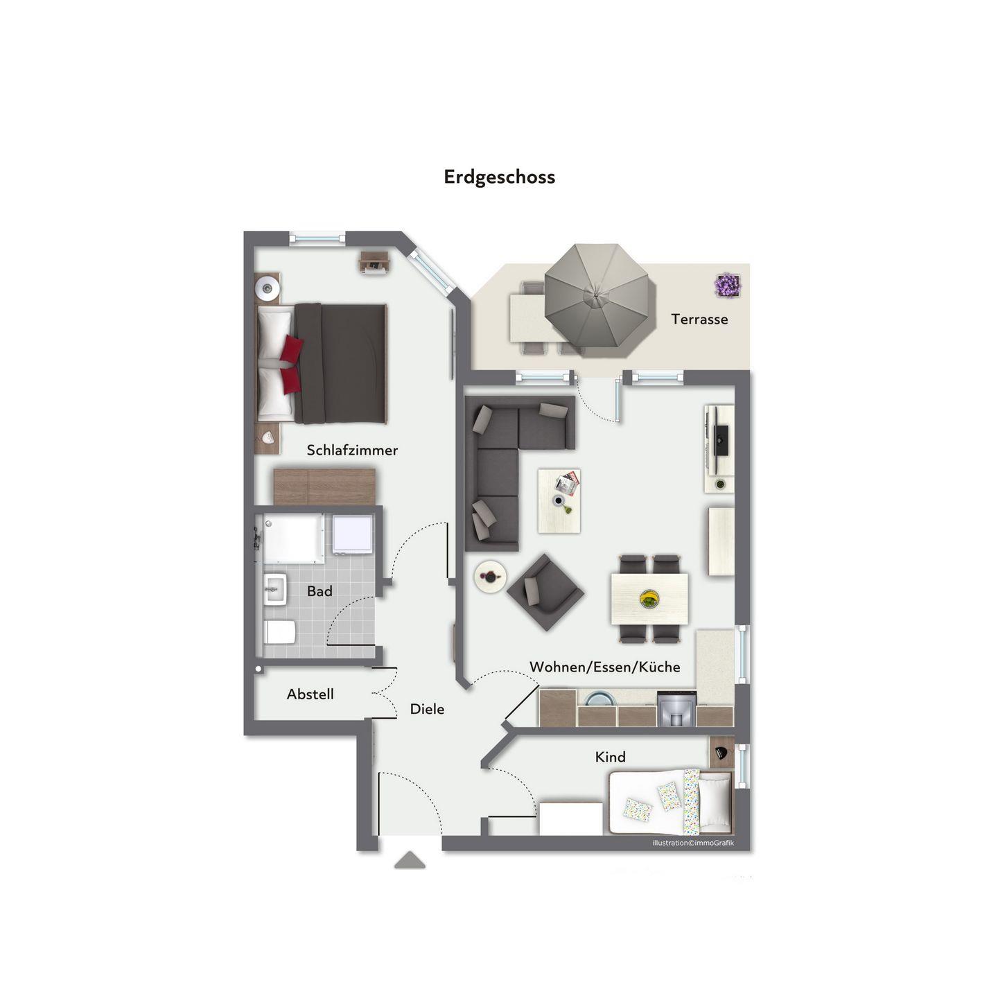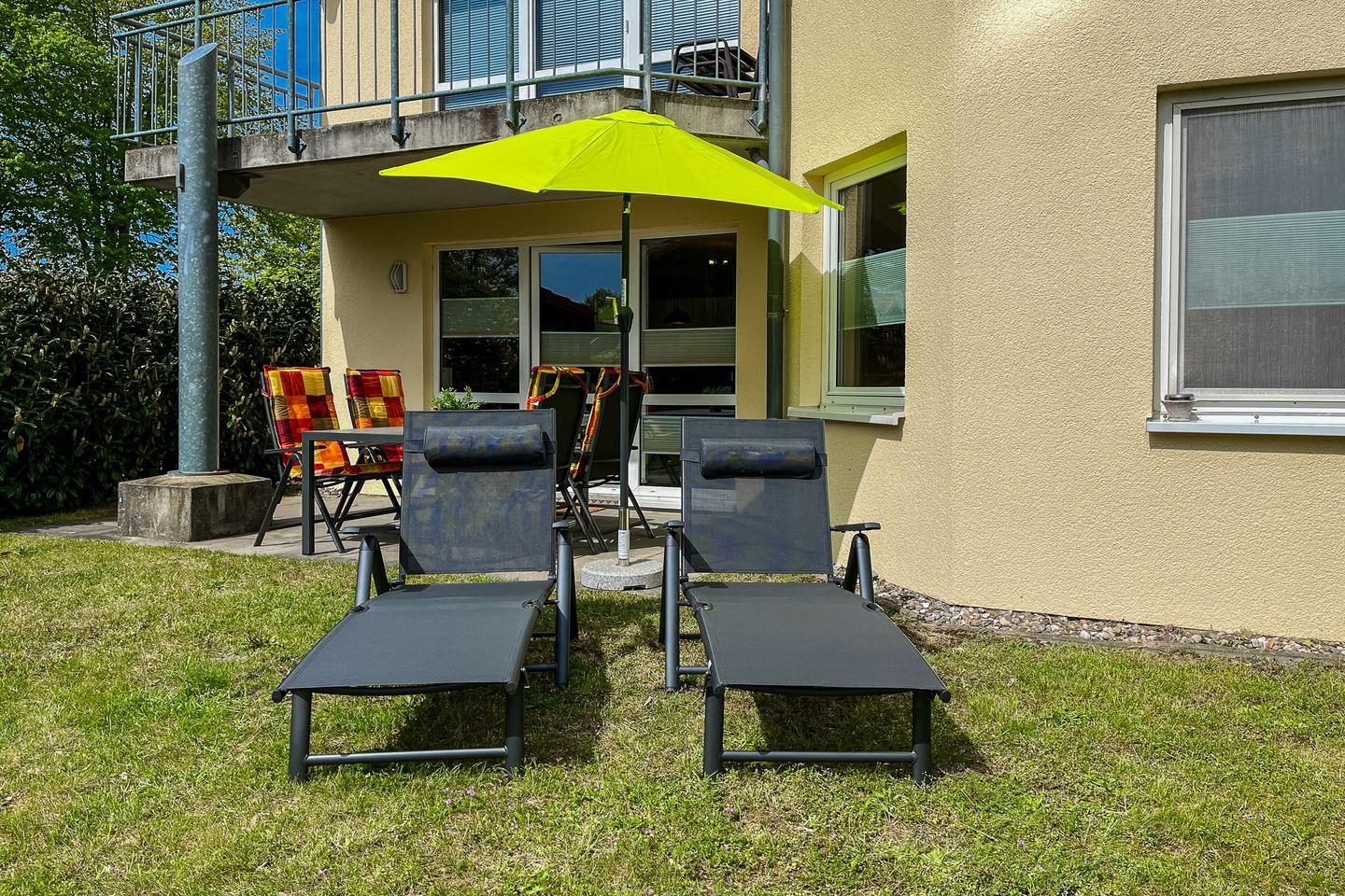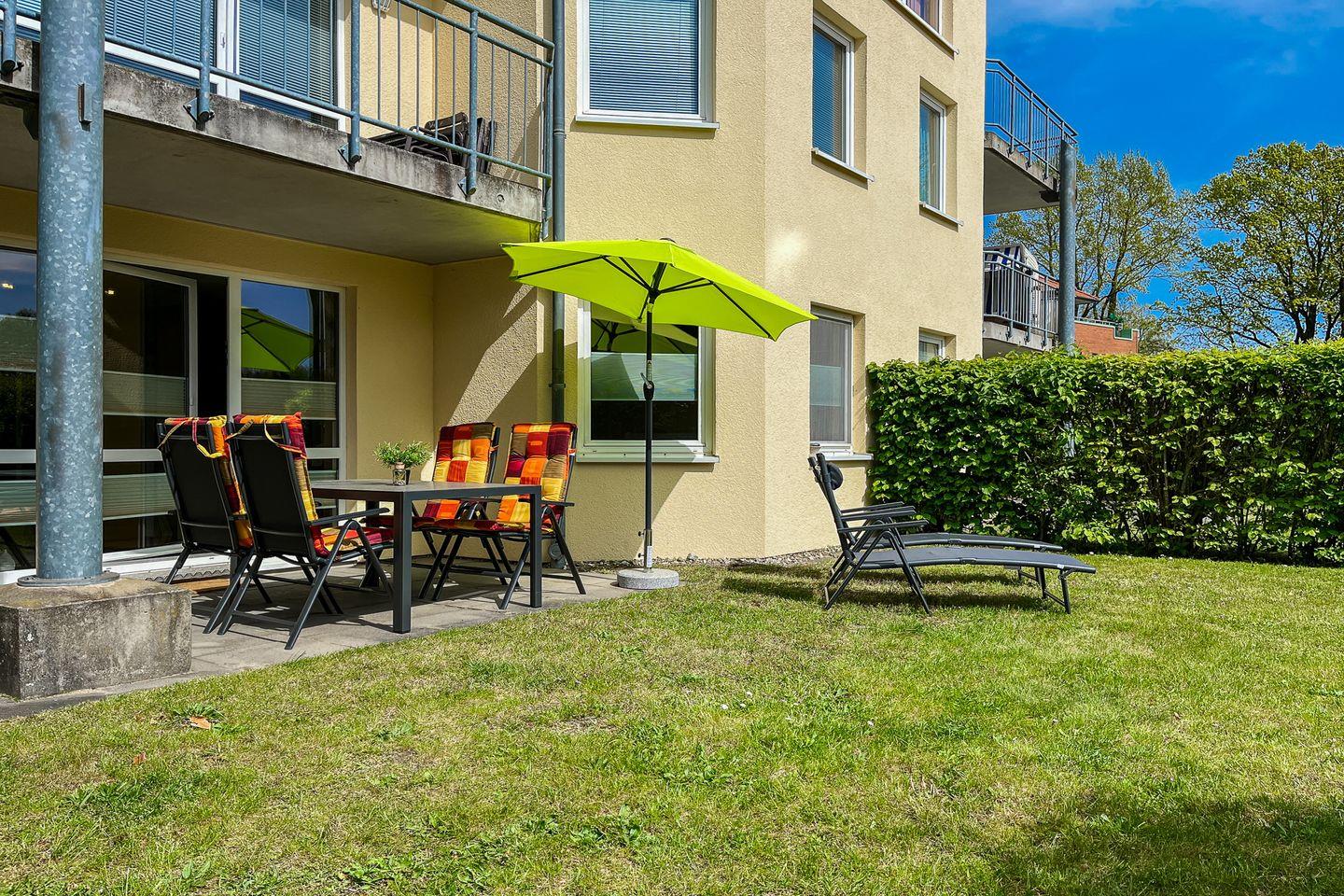 Deine Erdgeschosswohnung erstreckt sich über etwa 53 m² und umfasst ein Wohnzimmer, zwei Schlafzimmer, eine Küchenzeile, ein Duschbad sowie eine möblierte Terrasse in Süd-West-Ausrichtung, nur etwa 150 Meter vom Strand entfernt.