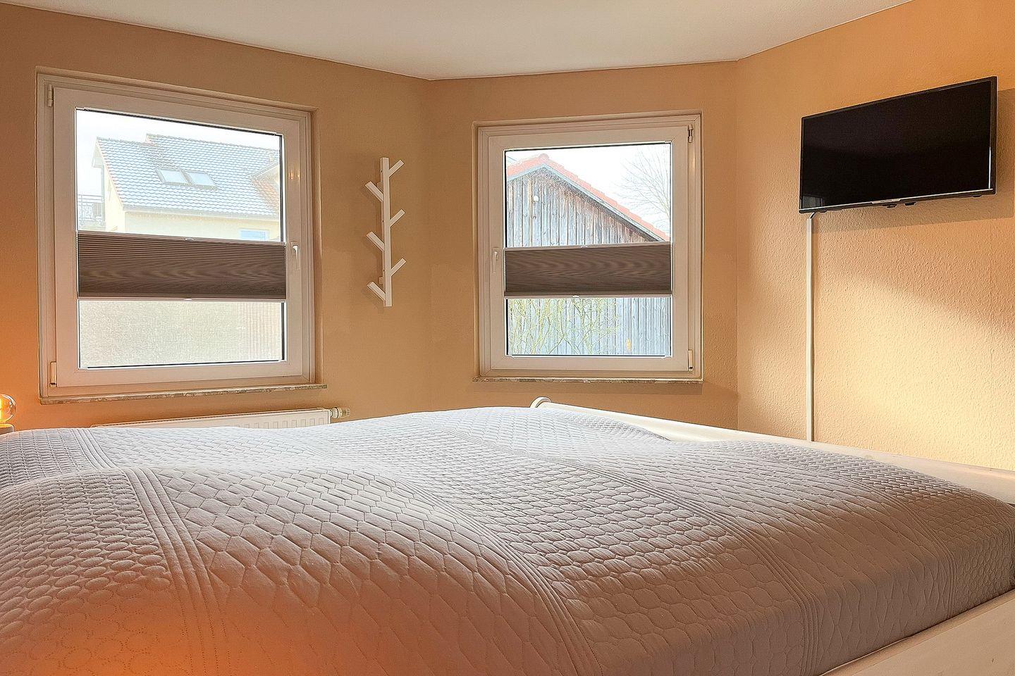 Das komfortable Doppelbett (2 x 90 x 200 cm) im Schlafzimmer verspricht dir erholsamen Schlaf. Vorhänge an den Fenstern dienen als Sicht- bzw. Sonnenschutz. Der geflieste Boden in Wohn- und Schlafzimmer verleiht eine angenehme Atmosphäre. Das kleinere Schlafzimmer ist mit einem Einzelbett sowie einem Kleiderschrank ausgestattet. Beide Schlafzimmer sind mit je einem Insektenschutzgitter versehen.