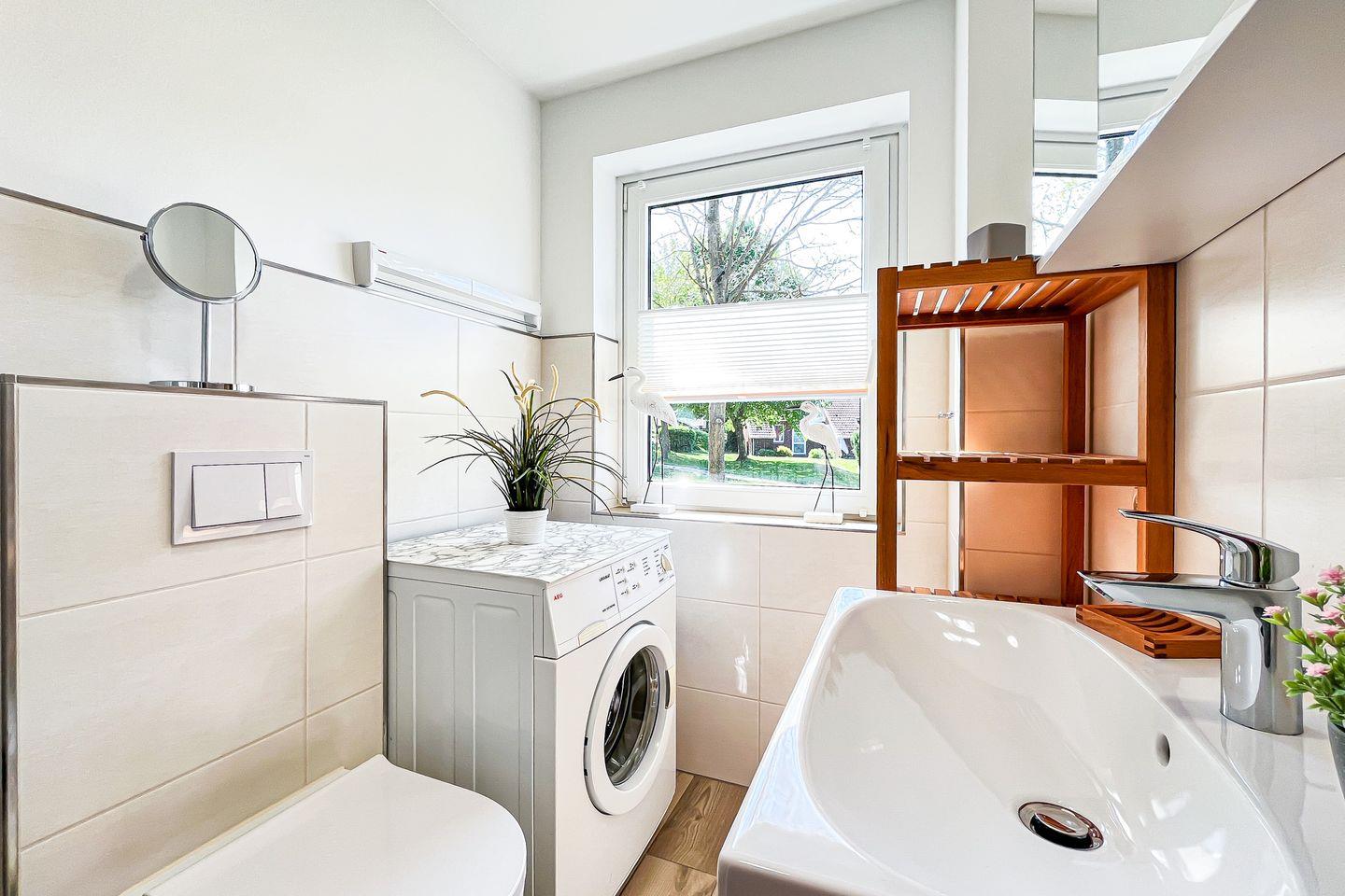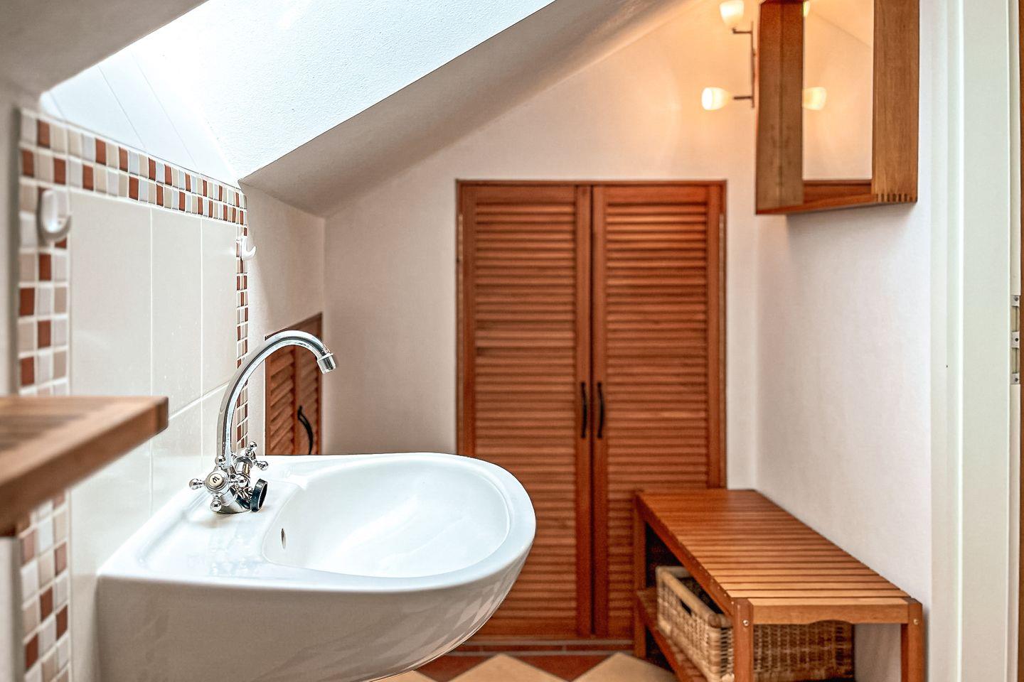 Das Duschbad im Erdgeschoss hat eine Dusche. Ein Gäste-WC findest du im Dachgeschoss vor. Dieses erreichst du über das Schlafzimmer mit Doppelbett. Zu diesem Ferienhaus gehört eine Waschmaschine. Der Boden wurde im Erdgeschoss mit Fliesen ausgelegt. Der Schlafraum im Dachgeschoss ist mit Laminat versehen. In dieser Nichtraucherwohnung sind Haustiere nicht erlaubt.