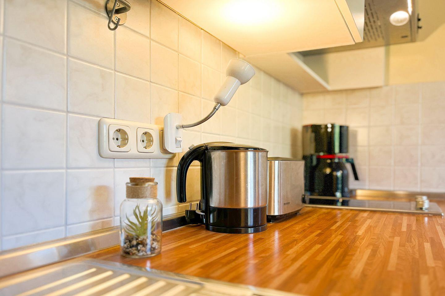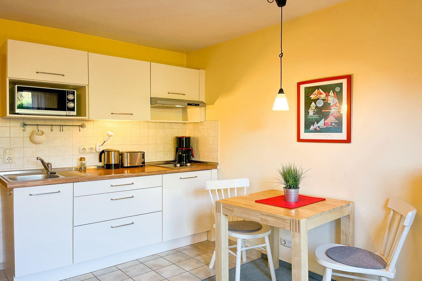 Die integrierte Küche ist praktisch mit einem 2-Platten-Ceranherd, einer Mikrowelle, einem Kühlschrank mit Gefrierfach und ausreichend Geschirr - ideal für die Selbstversorgung - ausgestattet. Der Boden ist in der gesamten Wohnung mit Teppich ausgelegt.