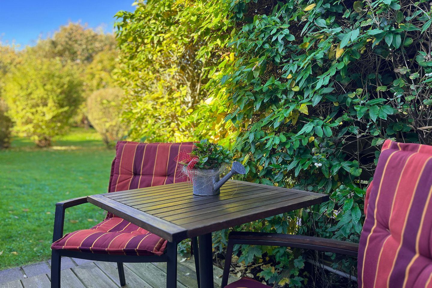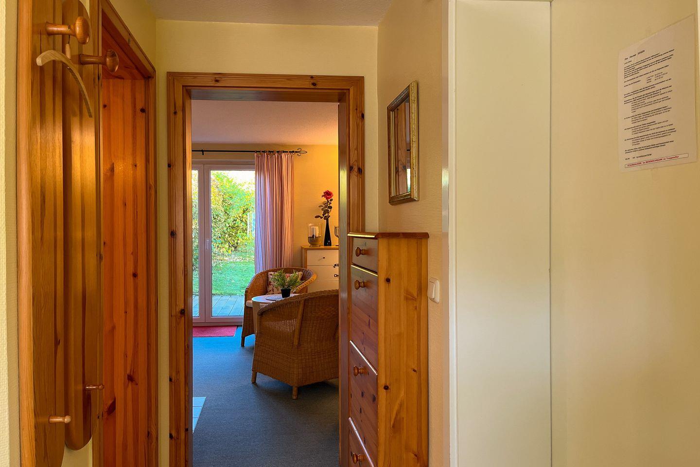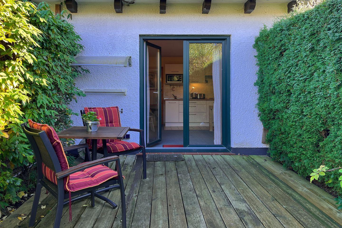 Die 2- Zimmer-Ferienwohnung verfügt über eine Terrasse mit Sicht zum Garten, einer im Wohnbereich integrierten Küche sowie ein Schlafzimmer. Haustiere sind nicht erlaubt.