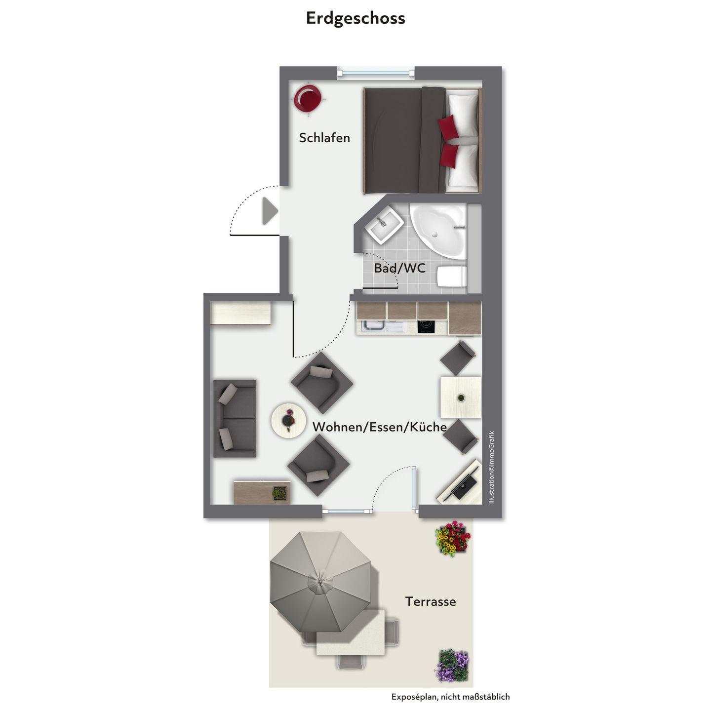 Es erwartet dich ein Wohn-/ Essbereich, ein Schlafzimmer, eine im Wohnbereich integrierte Küche sowie ein gefliestes Duschbad.