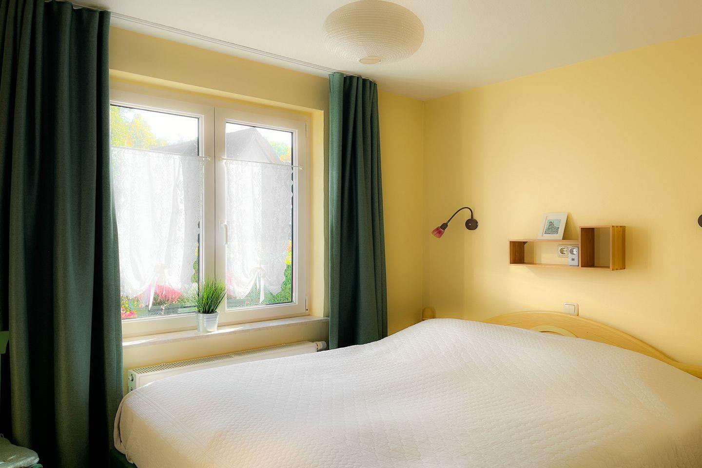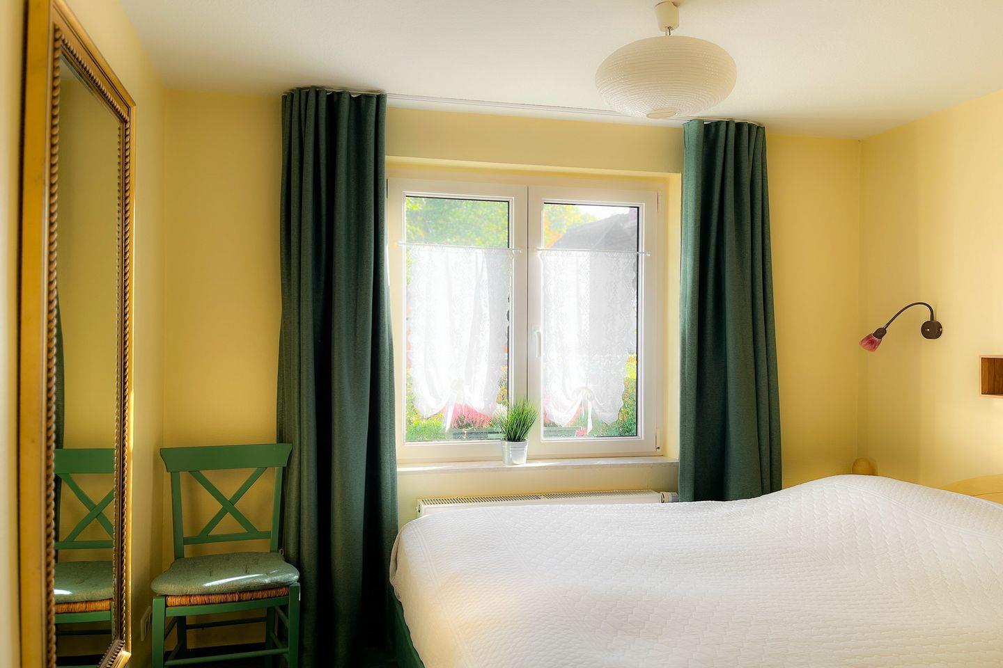 Im Schlafzimmer steht ein Doppelbett (180 x 200 cm). Selbstverständlich ist ein Kleiderschrank zur Unterbringung der Urlaubsgarderobe (im Wohnbereich) vorhanden. Die Fenster kannst du mit Vorhängen verdunkeln. In dieser Nichtraucherwohnung sind keine Haustiere erlaubt.