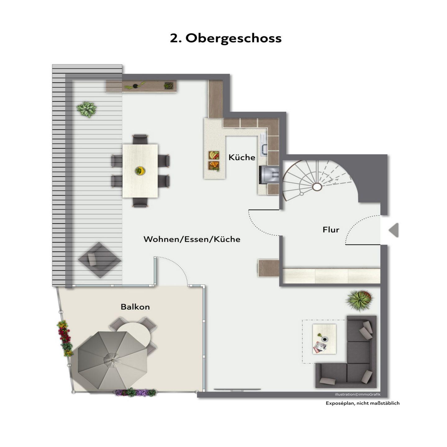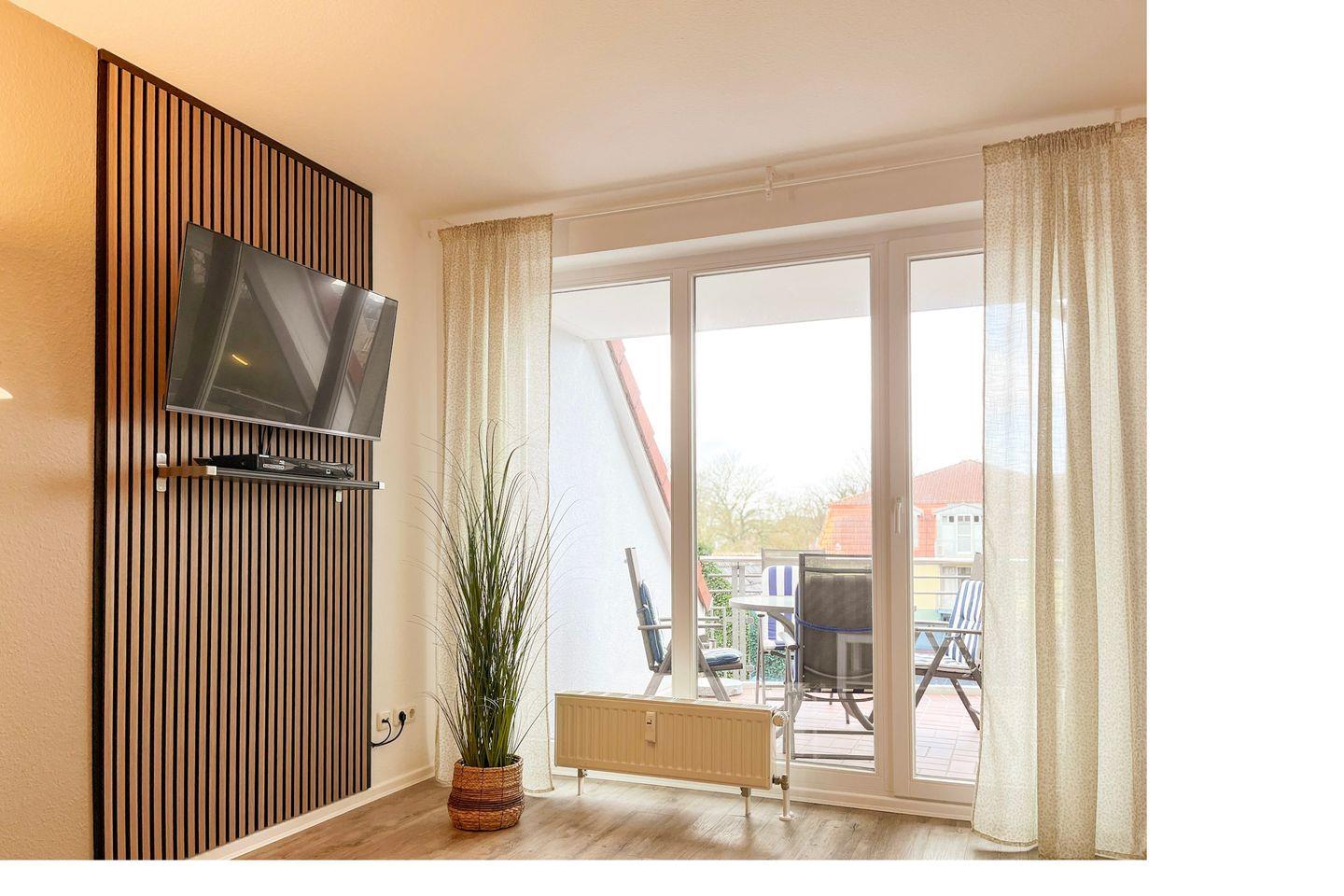 Die Ferienwohnung ist hochwertig ausgestattet. Im unteren Bereich befindet sich das Wohnzimmer. Hier verfügst du über einen Flachbildfernseher, einen Blu-Ray/DVD-Player und ein Radio. Eine Doppelschlafcouch (ca.130 x 190 cm) bietet einen komfortablen Schlafplatz. Vom Wohnbereich hast du Zugang zur möblierten Sonnenterrasse.