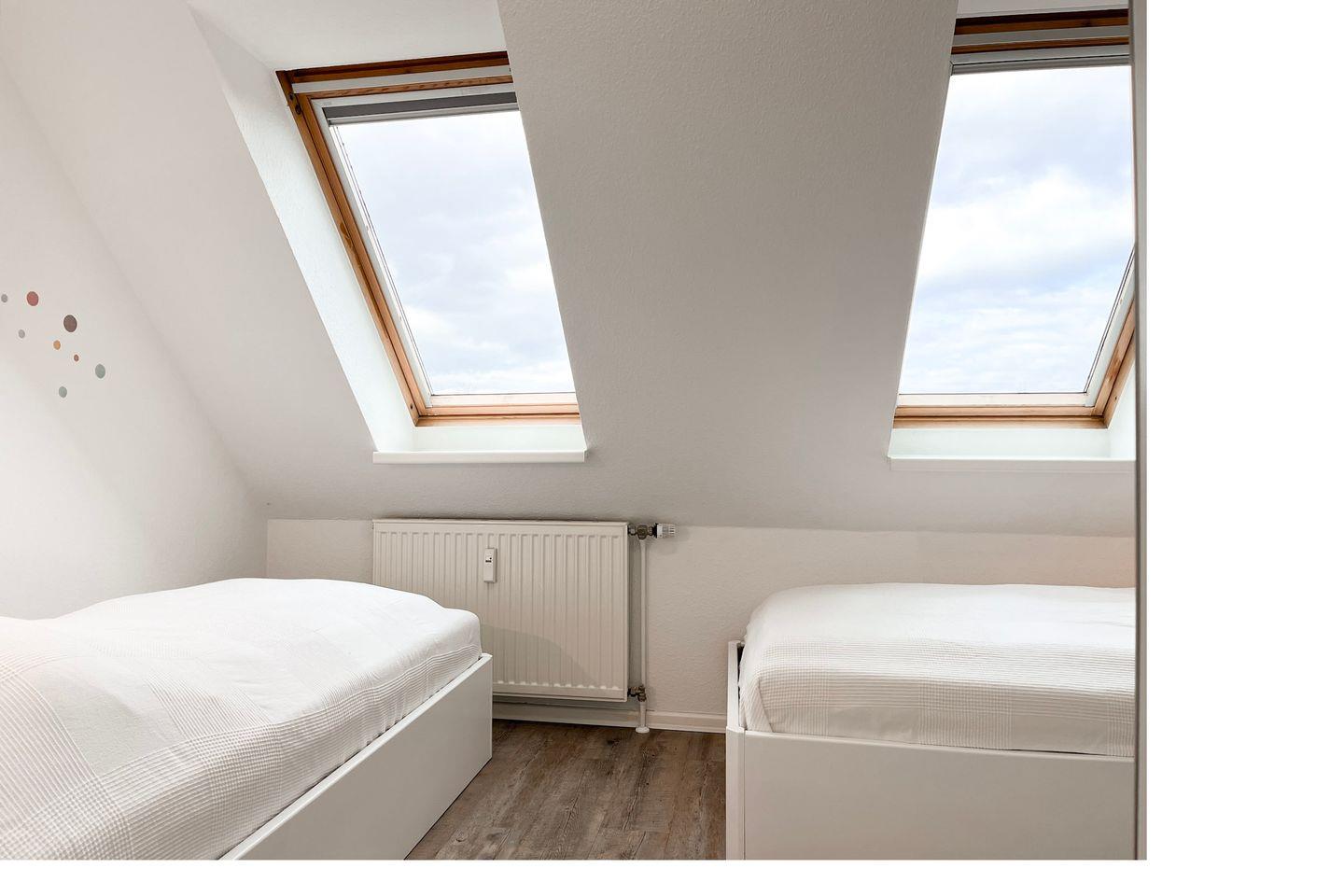 Die obere Ebene erreichst du über eine Wendeltreppe. Hier befinden sich zwei Schlafzimmer, die mit Vinyl ausgelegt sind. Im ersten Schlafzimmer verspricht ein Doppelbett (2 x 90 x 200 cm) erholsamen Schlaf. Ein großzügiger Kleiderschrank bietet viel Platz für deine Urlaubsgarderobe. Das zweite Schlafzimmer verfügt über zwei Einzelbetten (90 x 200 cm).Ein Kinderreisebett ist auch vorhanden.