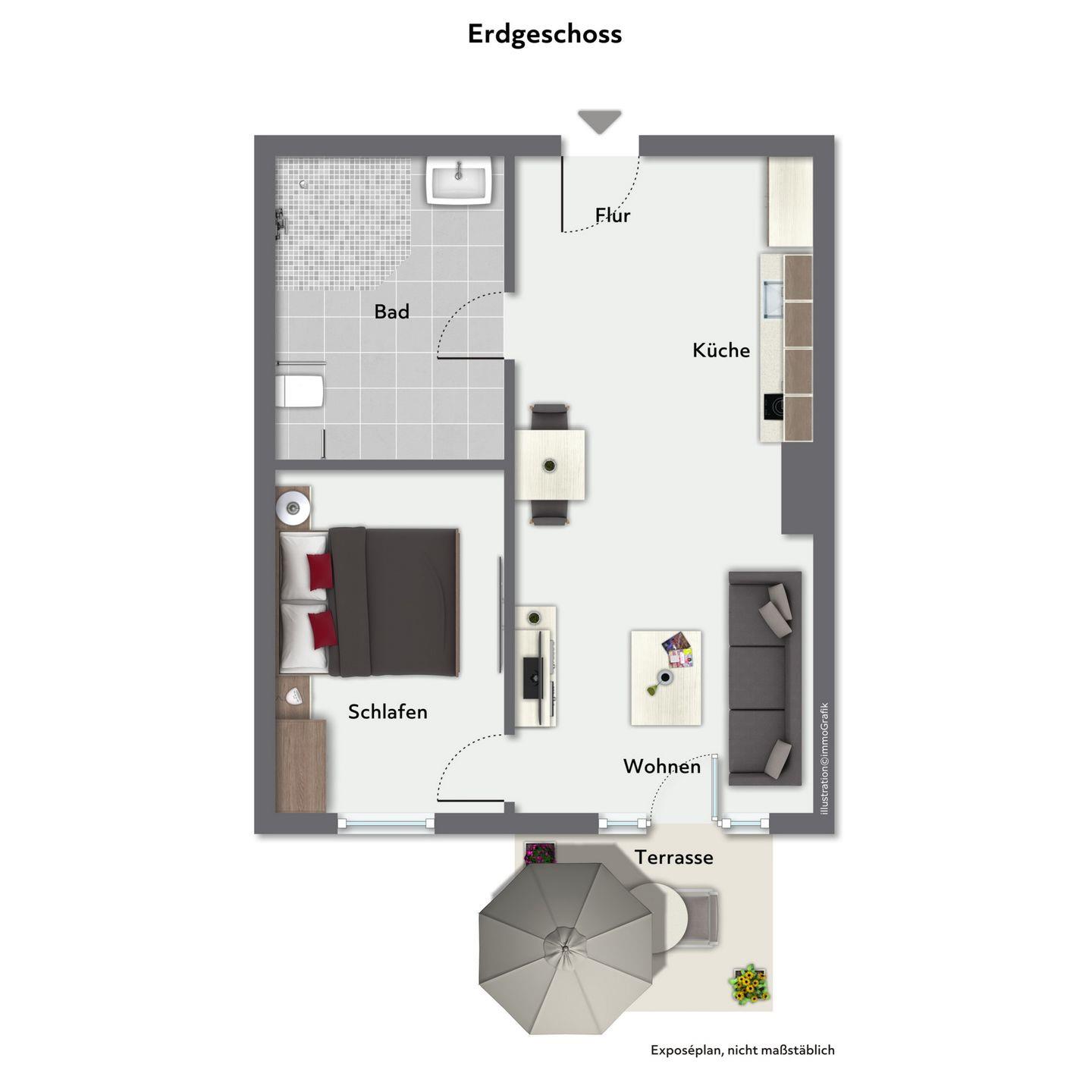 Ein besonderes Highlight ist die möblierte Terrasse mit Gartenblick – perfekt für ein entspanntes Frühstück an der frischen Luft oder ein Glas Wein am Abend.