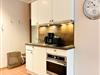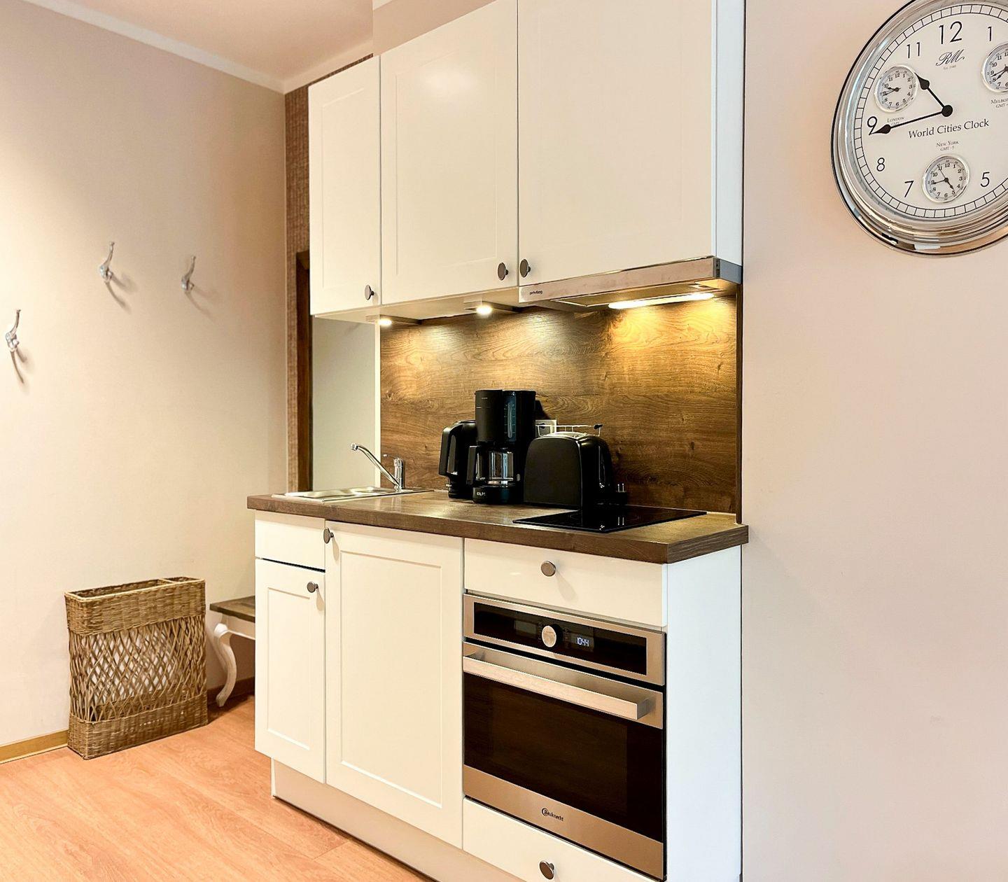 Die Küche ist offen in den Wohnbereich integriert und bestens ausgestattet: Cerankochfeld, Backofen, Kühlschrank mit Gefrierfach, Kaffeemaschine, Wasserkocher, Toaster sowie diverse Kochutensilien und Geschirr lassen keine Wünsche offen – perfekt für die Selbstverpflegung.