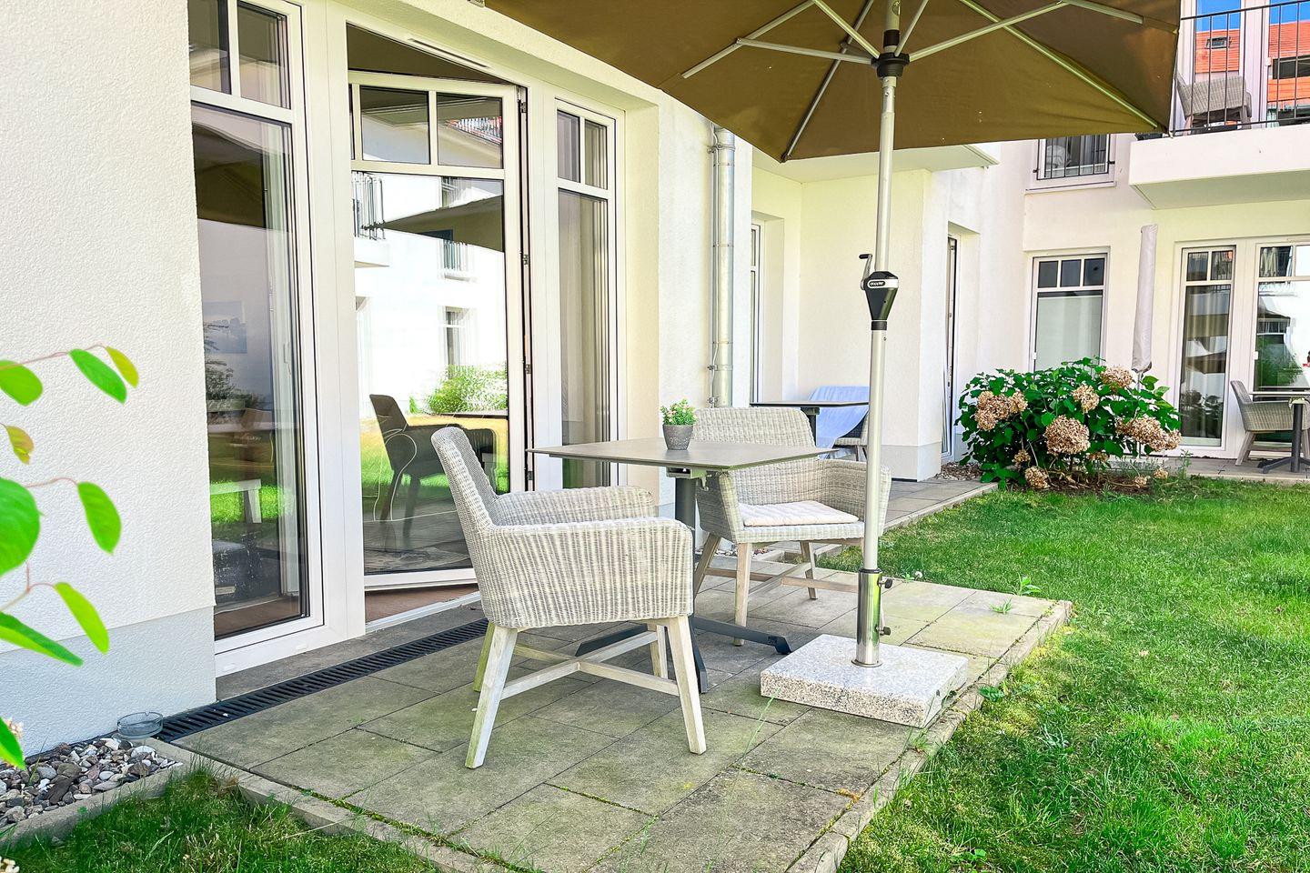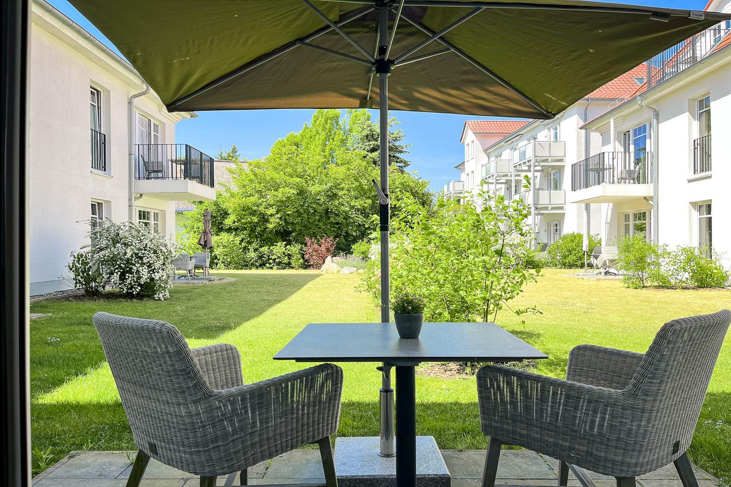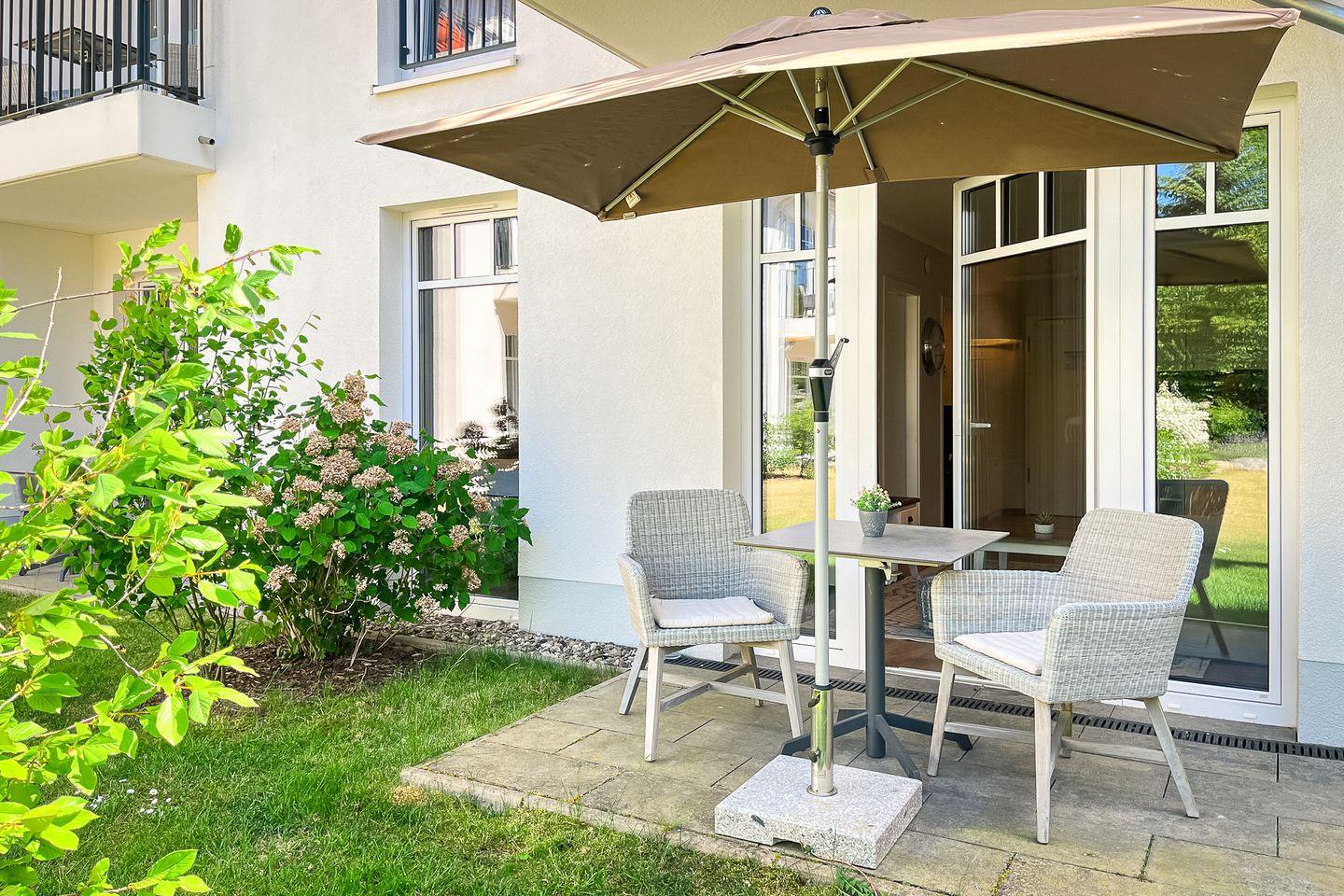 Ein Highlight ist die möblierte Terrasse mit Gartenblick und Sonnenschirm – der perfekte Ort, um draußen zu entspannen und die Ostseeluft zu genießen.