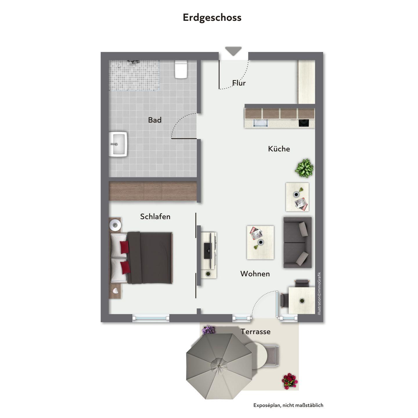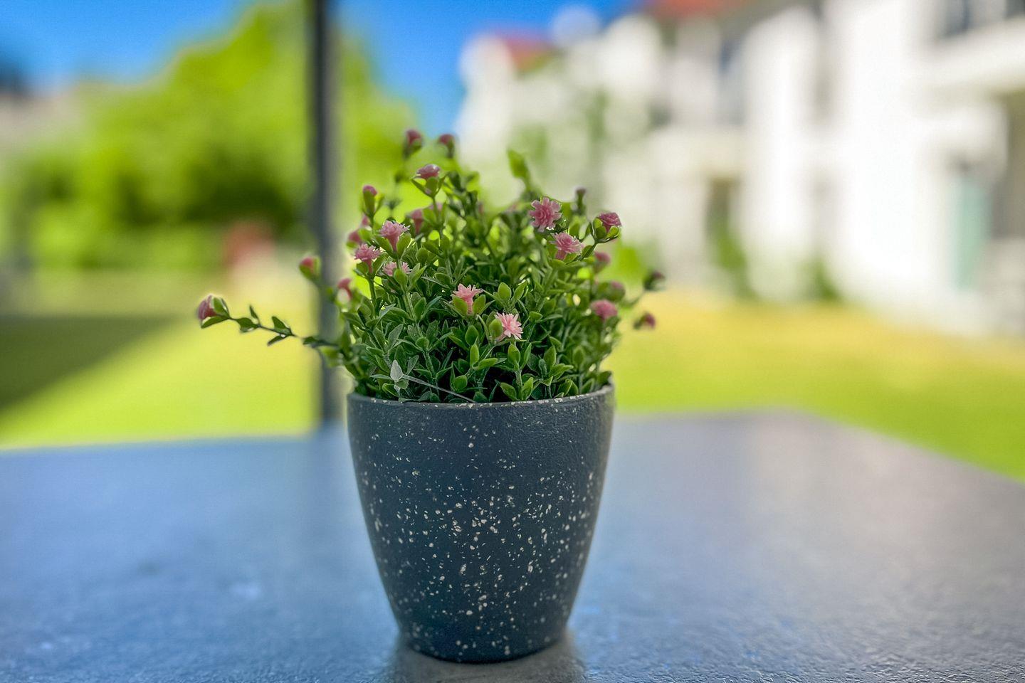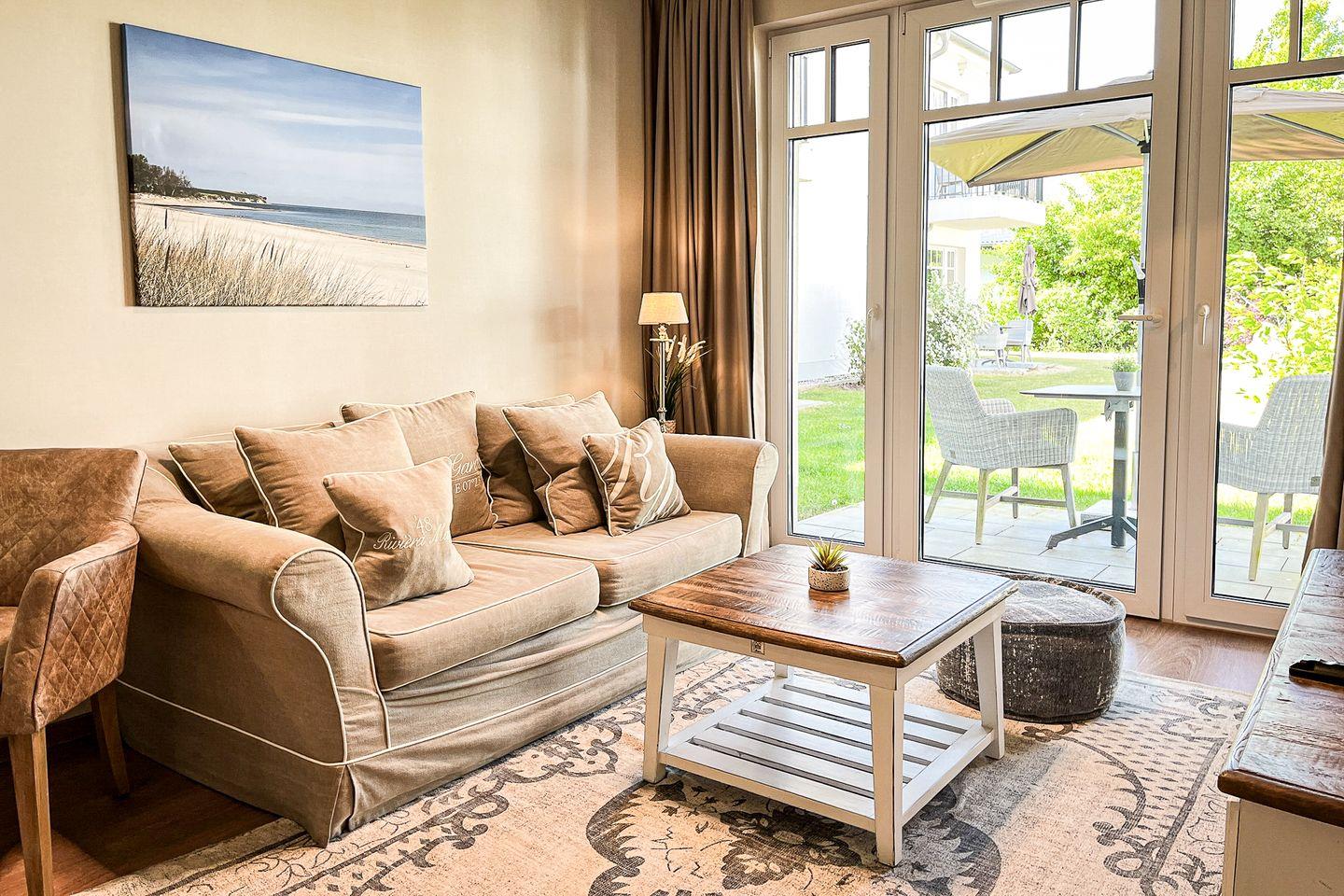 Ein Highlight ist die möblierte Terrasse mit Gartenblick und Sonnenschirm – der perfekte Ort, um draußen zu entspannen und die Ostseeluft zu genießen.