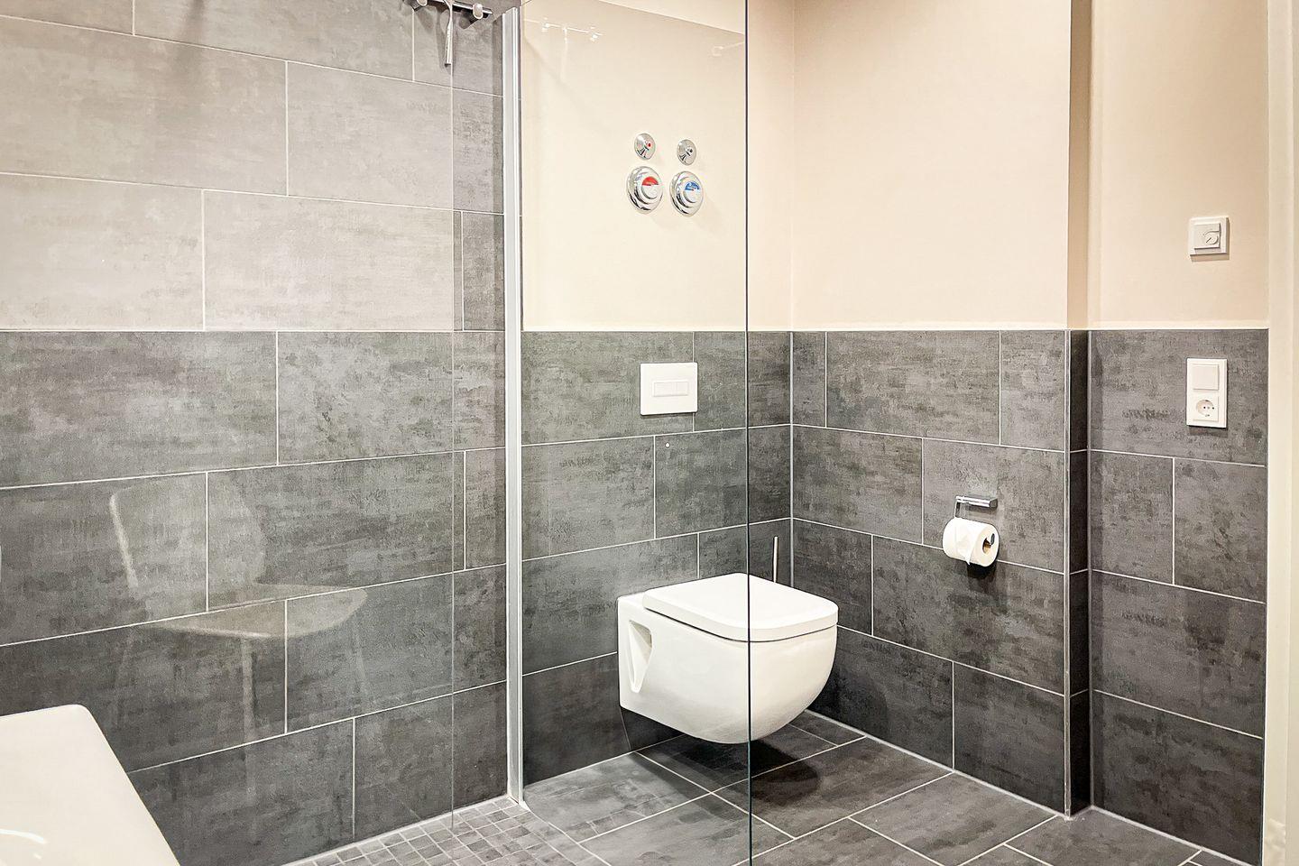 Das moderne Badezimmer verfügt über eine bodengleiche Dusche, WC, Waschbecken, Kosmetikspiegel und einen Haartrockner – alles für Deinen täglichen Komfort.