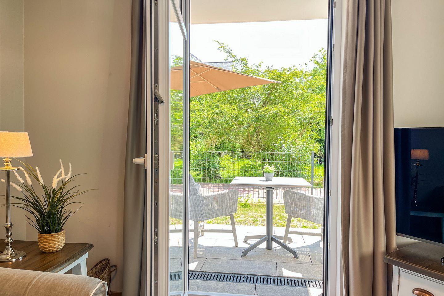 Ein echtes Highlight ist die möblierte Terrasse: Hier genießt Du die frische Ostseeluft, sonnige Nachmittagsstunden und eine angenehm ruhige Atmosphäre. Dank der geschützten Lage eignet sich dieser Bereich ideal zum Lesen, Entspannen oder für gemütliche Mahlzeiten im Freien. Ein kleine stimmungsvoller Blick in Richtung Ostsee verleiht der Terrasse zusätzlich maritimen Charme.