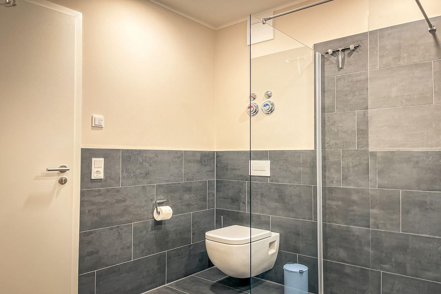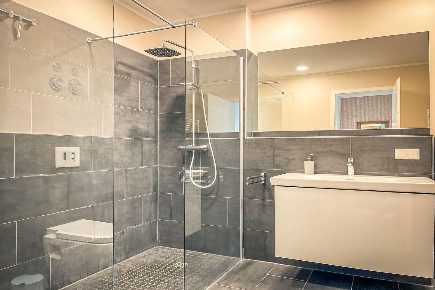 Das Badezimmer verfügt über eine bodengleiche Dusche, ein WC, Waschbecken, Kosmetikspiegel und einen Haartrockner – praktisch und modern zugleich.