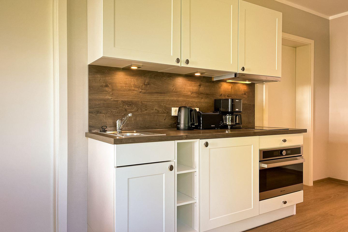 Die offen gestaltete Küche ist vollständig ausgestattet mit Cerankochfeld, Backofen, Kühlschrank mit Gefrierfach, Kaffeemaschine, Wasserkocher, Toaster sowie sämtlichen Koch- und Essutensilien – ideal für Selbstversorger.