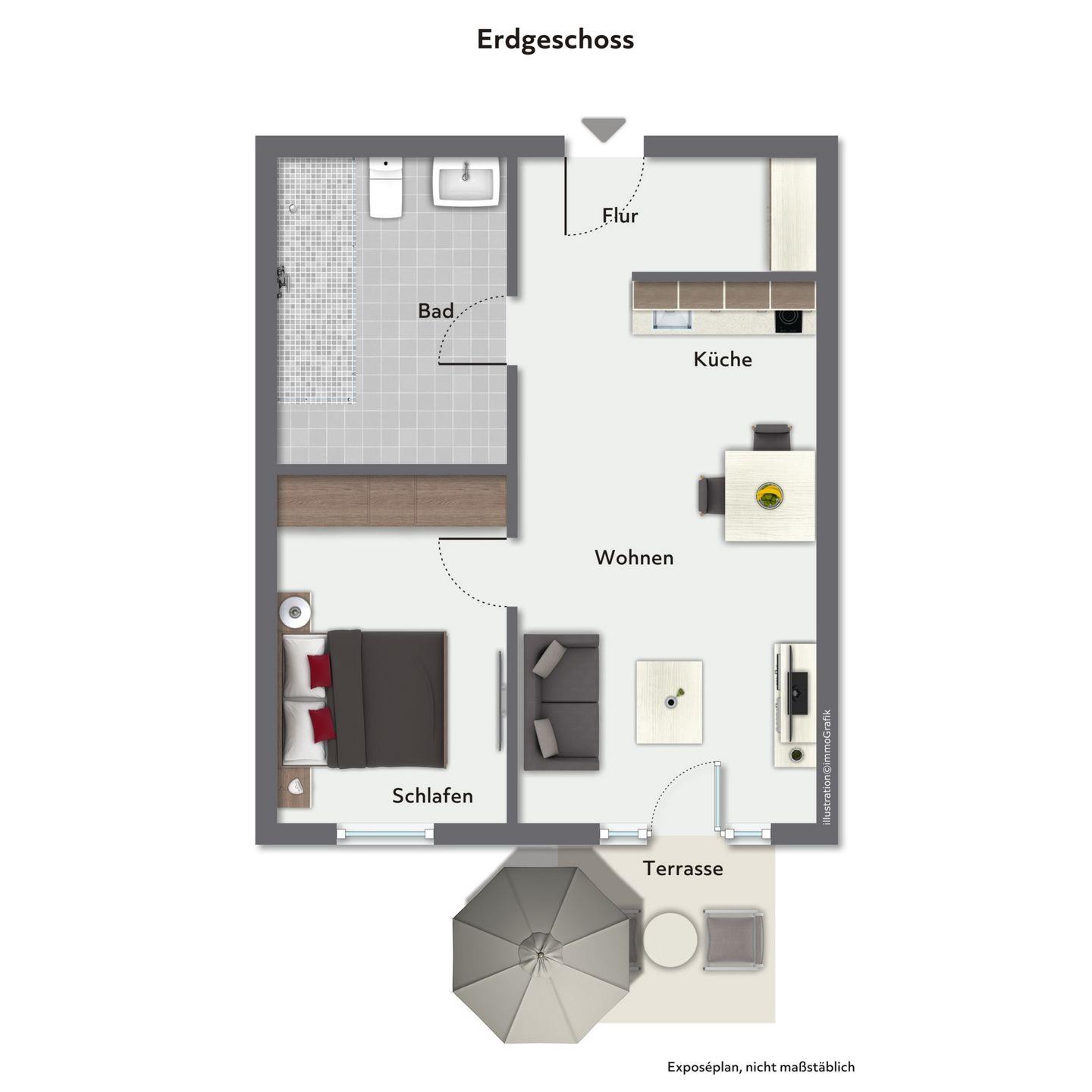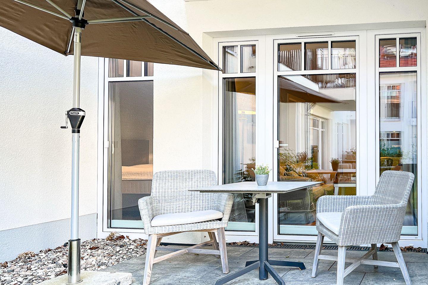 Die Terrasse mit Gartenmöbeln und Sonnenschirm lädt zum Frühstück im Freien oder zum entspannten Lesen an der frischen Luft ein.