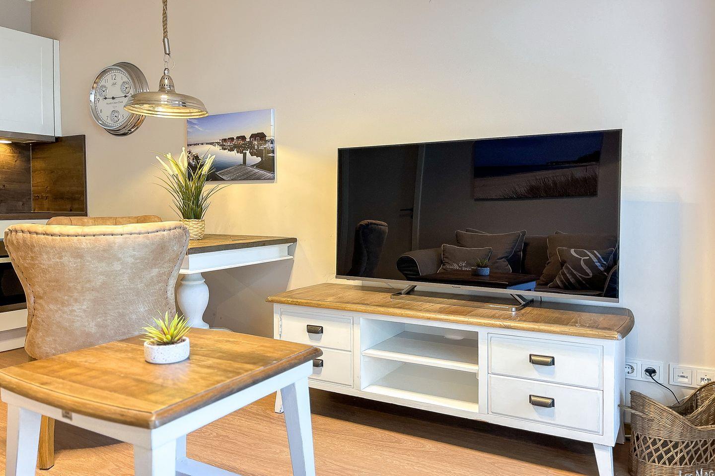 Im Wohnbereich lädt ein Sofa zum Entspannen ein. Ein Flachbild-TV sorgt für Unterhaltung, während der Essbereich mit Tisch und zwei Stühlen Platz für gemeinsame Mahlzeiten bietet.