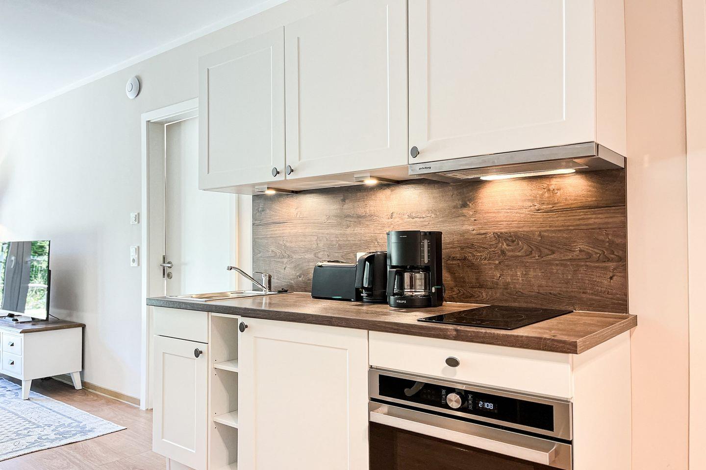 Die offen integrierte Küche ist vollständig eingerichtet: Cerankochfeld, Backofen, Kühlschrank mit Gefrierfach, Kaffeemaschine, Wasserkocher, Toaster und sämtliches Koch- und Essgeschirr stehen bereit – ideal für Selbstversorger.