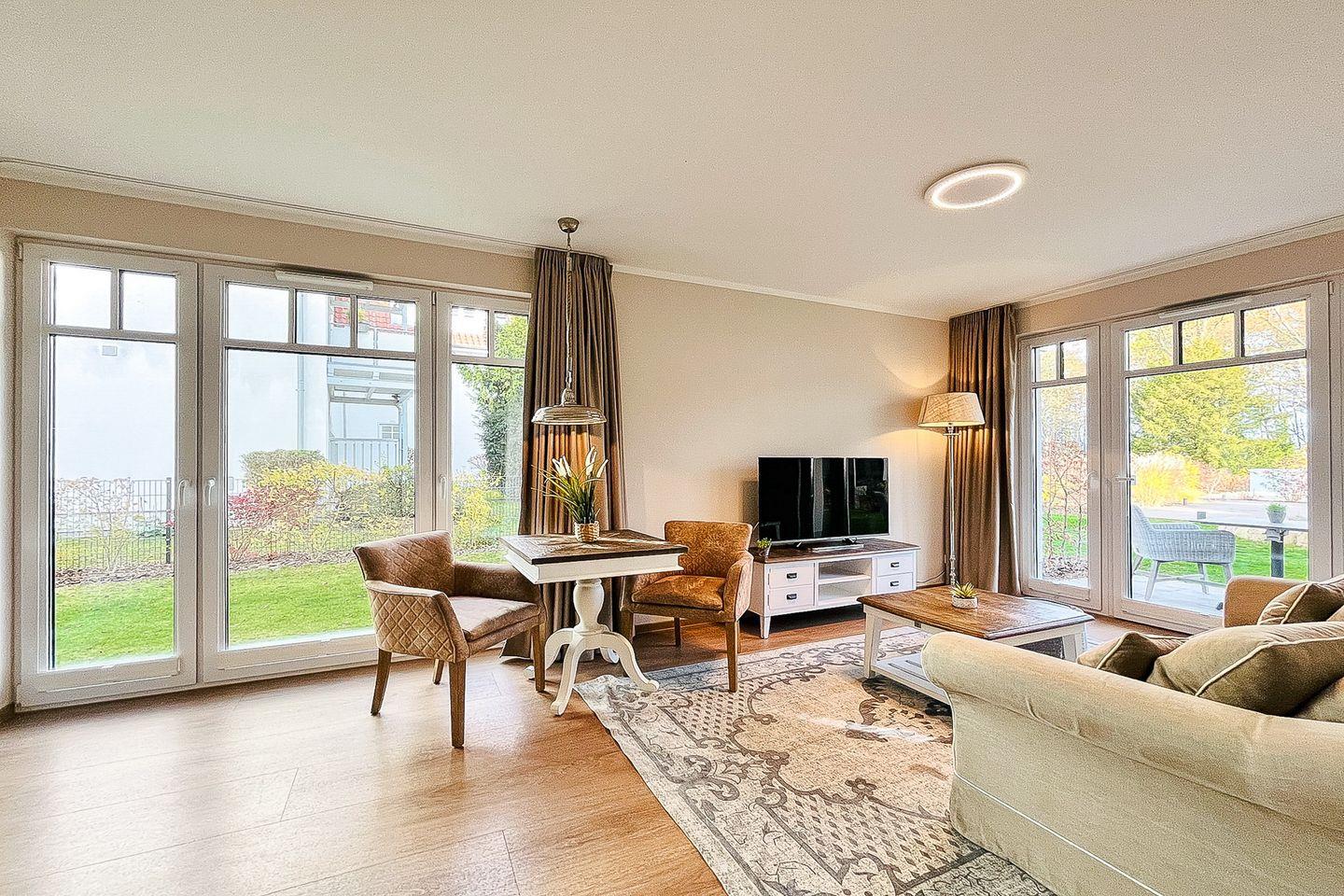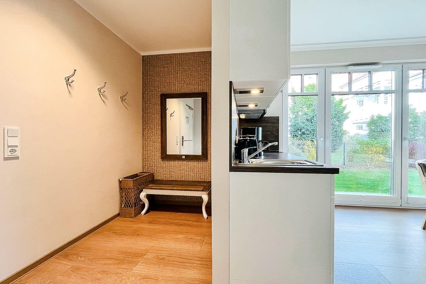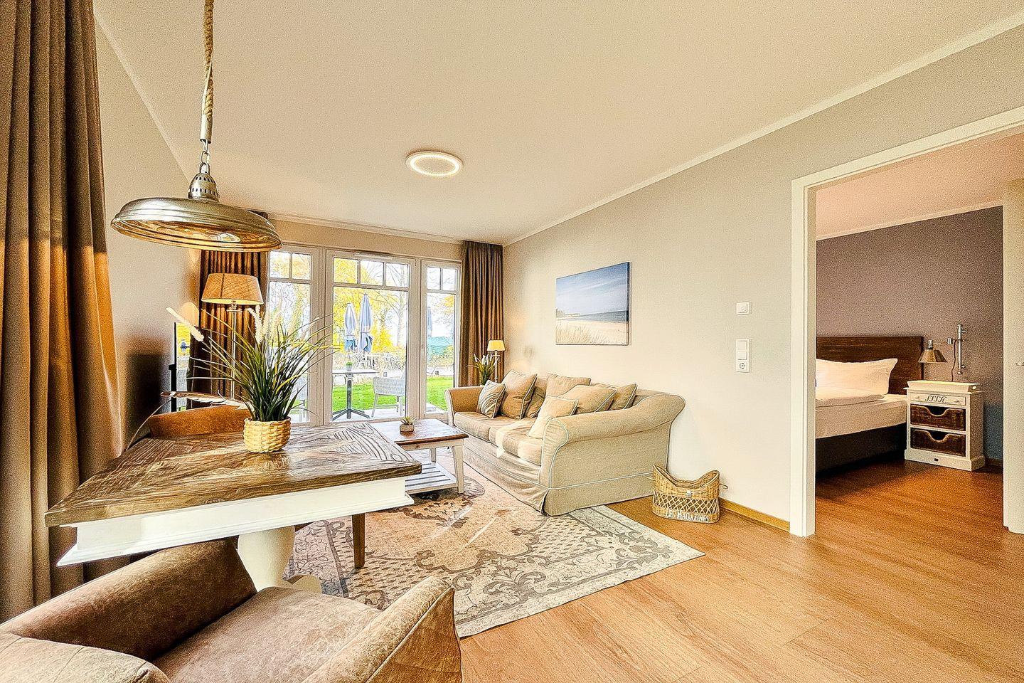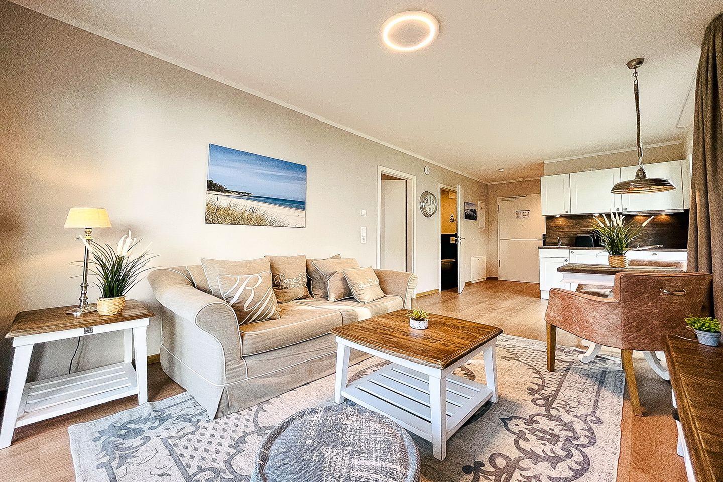 Das Apartment liegt im Erdgeschoss und bietet auf ca. 48 m² Wohnfläche eine geschmackvolle Einrichtung und eine gelungene Raumaufteilung – ideal für Paare, die Komfort und Nähe zum Strand suchen.