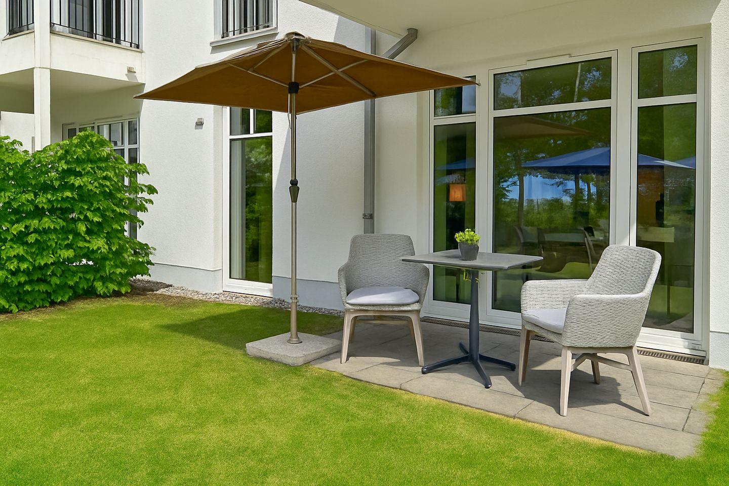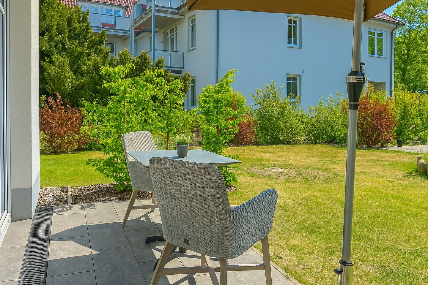 Ein echtes Highlight ist die möblierte Terrasse mit Garten- und eingeschränktem Meerblick – ideal, um die frische Ostseeluft zu genießen oder den Tag entspannt ausklingen zu lassen.