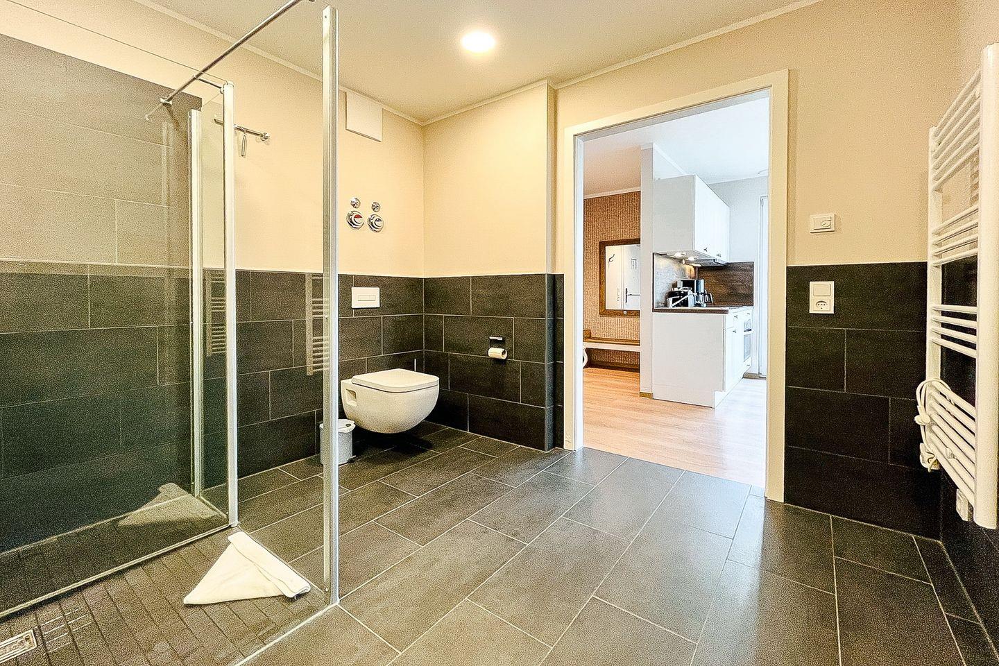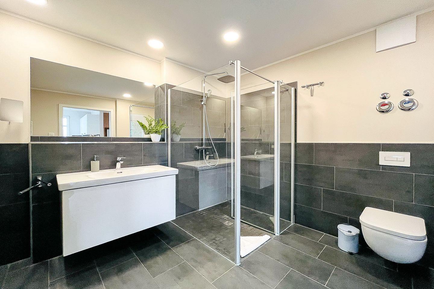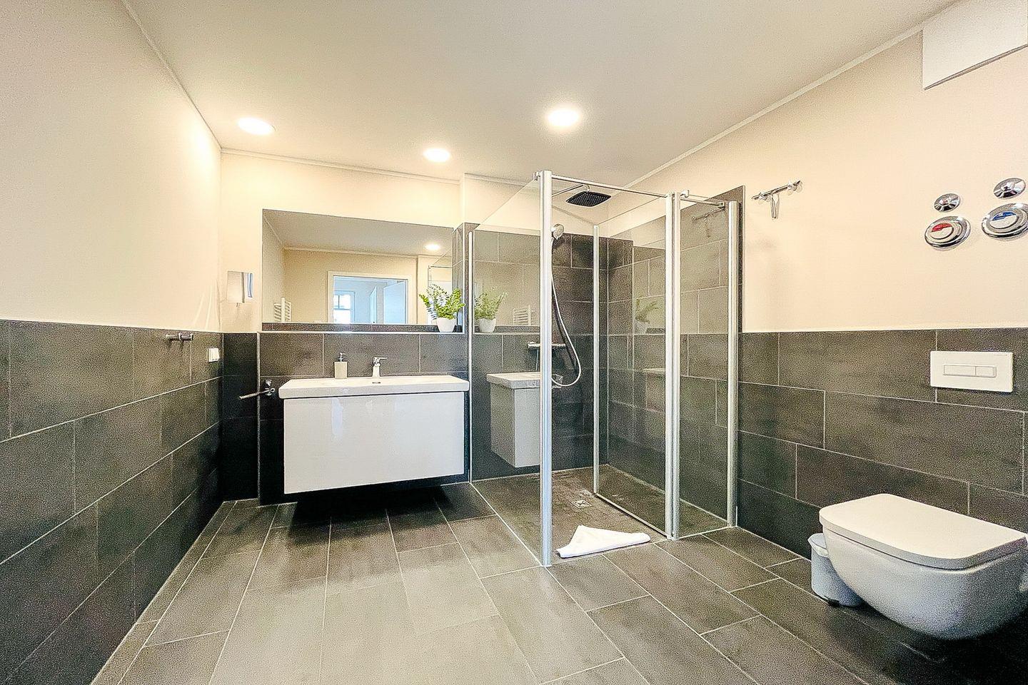 Das Badezimmer verfügt über eine bodengleiche Dusche, ein WC, Waschbecken, Kosmetikspiegel und einen Haartrockner – durchdacht und modern gestaltet.