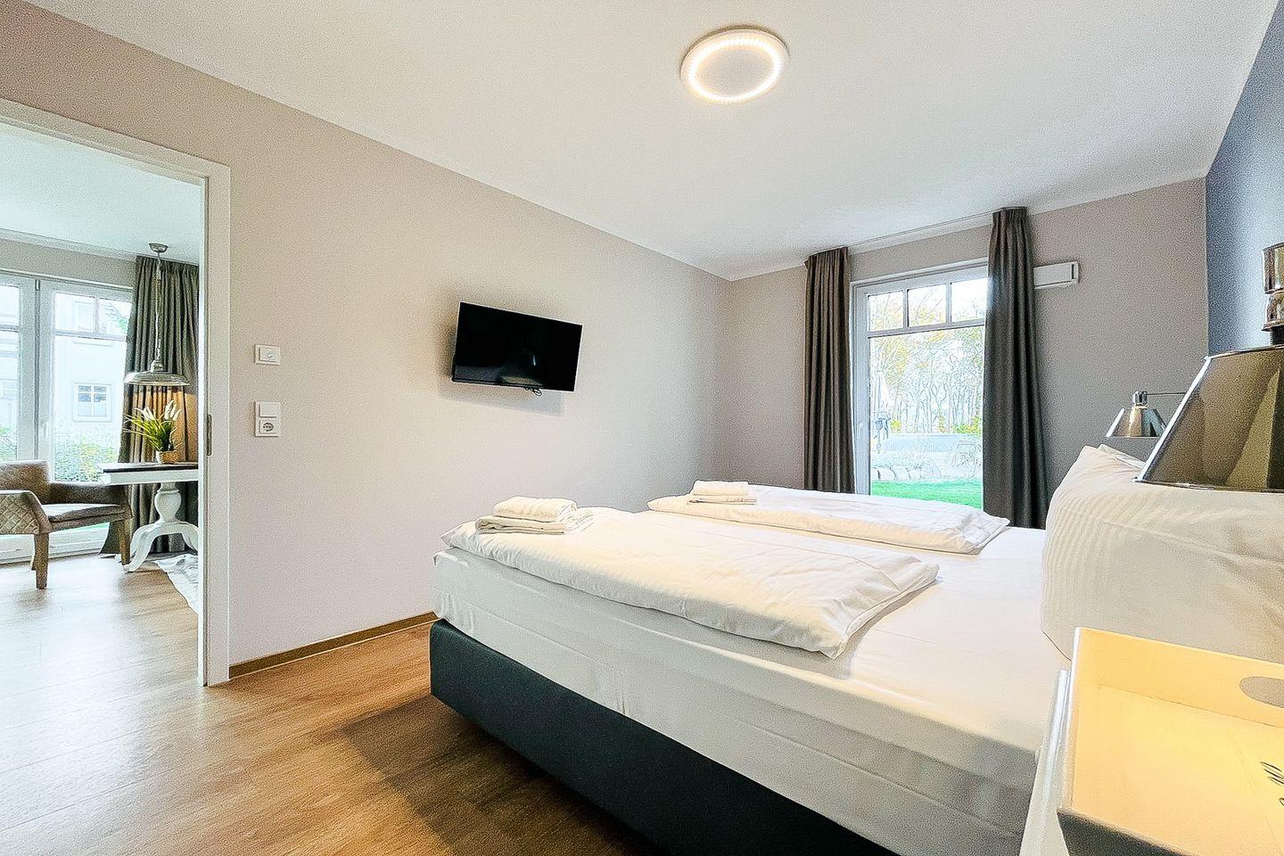 Im separaten Schlafzimmer findest Du ein komfortables Doppelbett (2x 90x200 cm) sowie einen zweiten Fernseher für entspannte Abende im Bett.