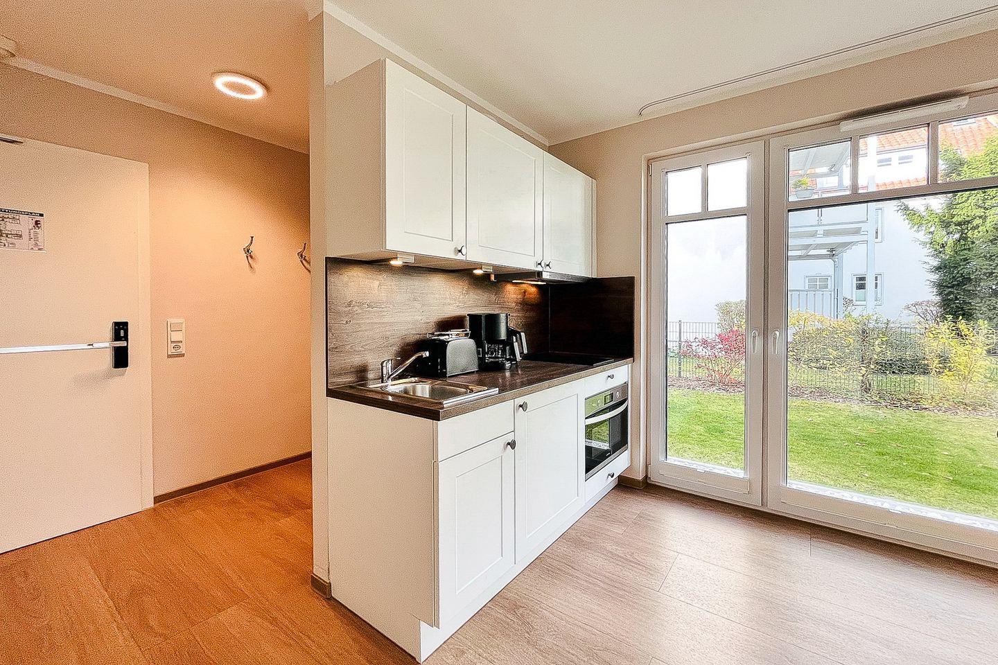 Die integrierte Küche ist funktional und modern ausgestattet: Cerankochfeld, Backofen, Kühlschrank mit Gefrierfach, Kaffeemaschine, Wasserkocher, Toaster sowie alle wichtigen Kochutensilien und Geschirr stehen zur Verfügung.