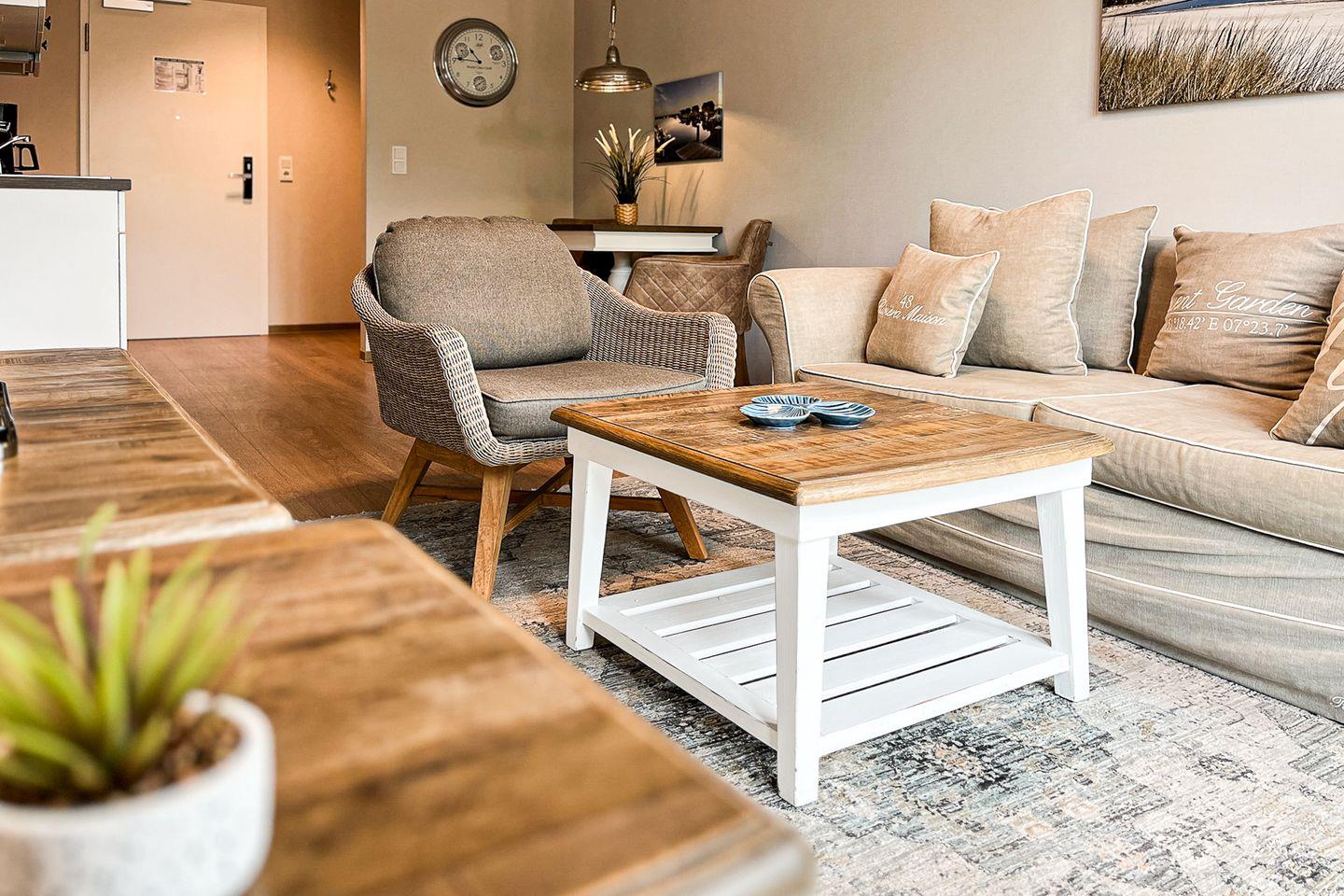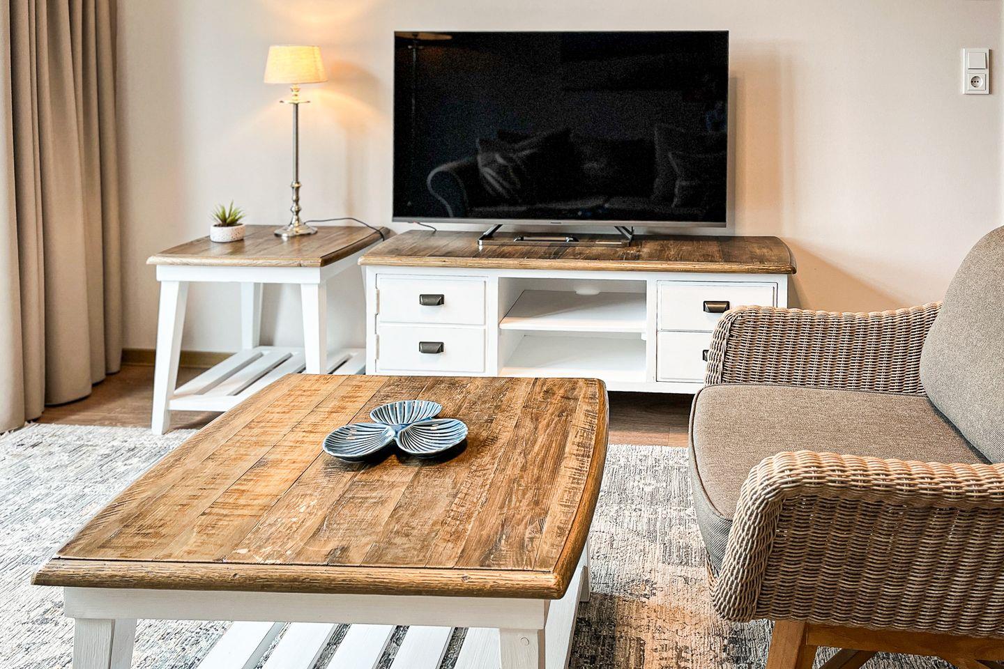 Im offenen Wohnbereich erwarten Dich ein bequemes Sofa, ein Flachbild-TV für gemütliche Stunden sowie ein kleiner Essplatz für zwei Personen.