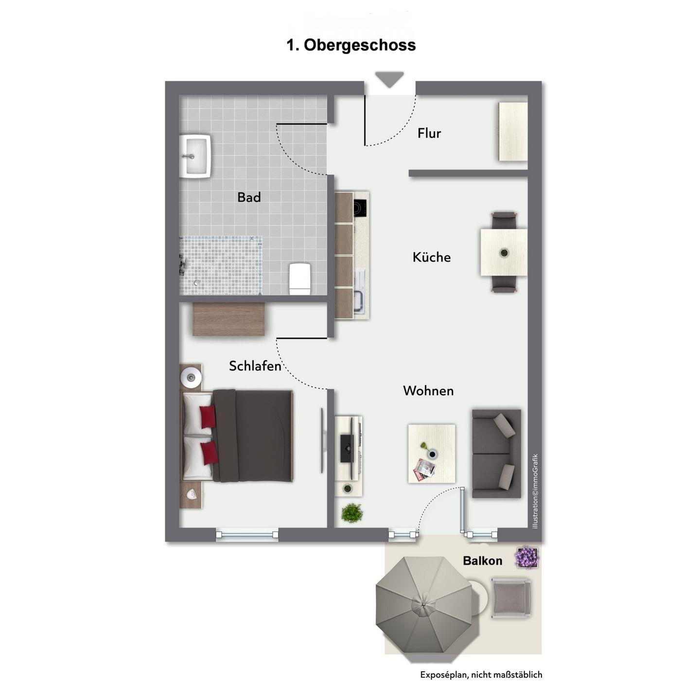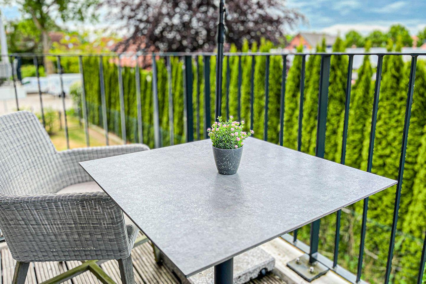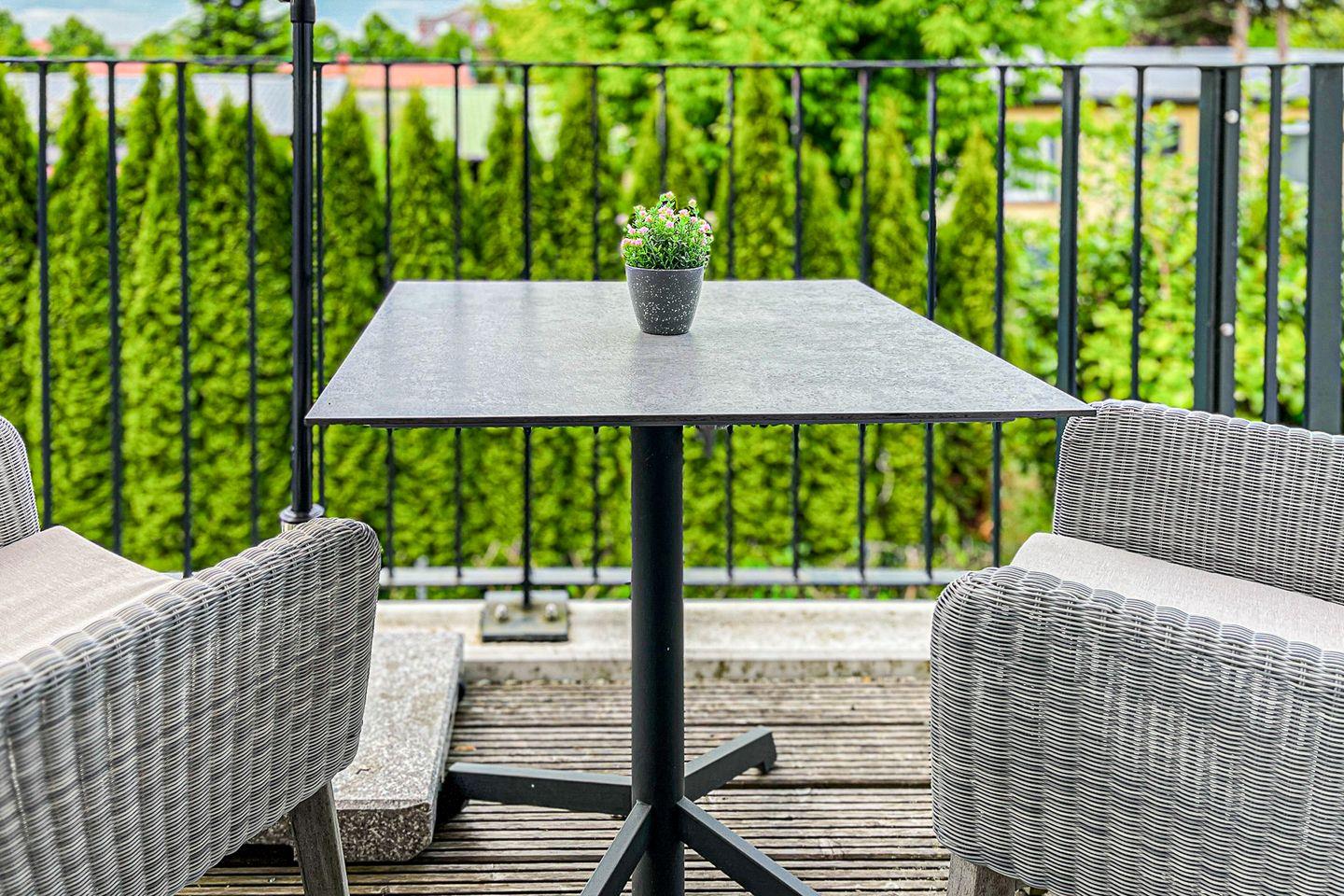 Ein möblierter Balkon mit Sonnenschirm lädt zu entspannten Momenten im Freien ein – sei es bei einer Tasse Kaffee am Morgen oder beim Lesen am Nachmittag.