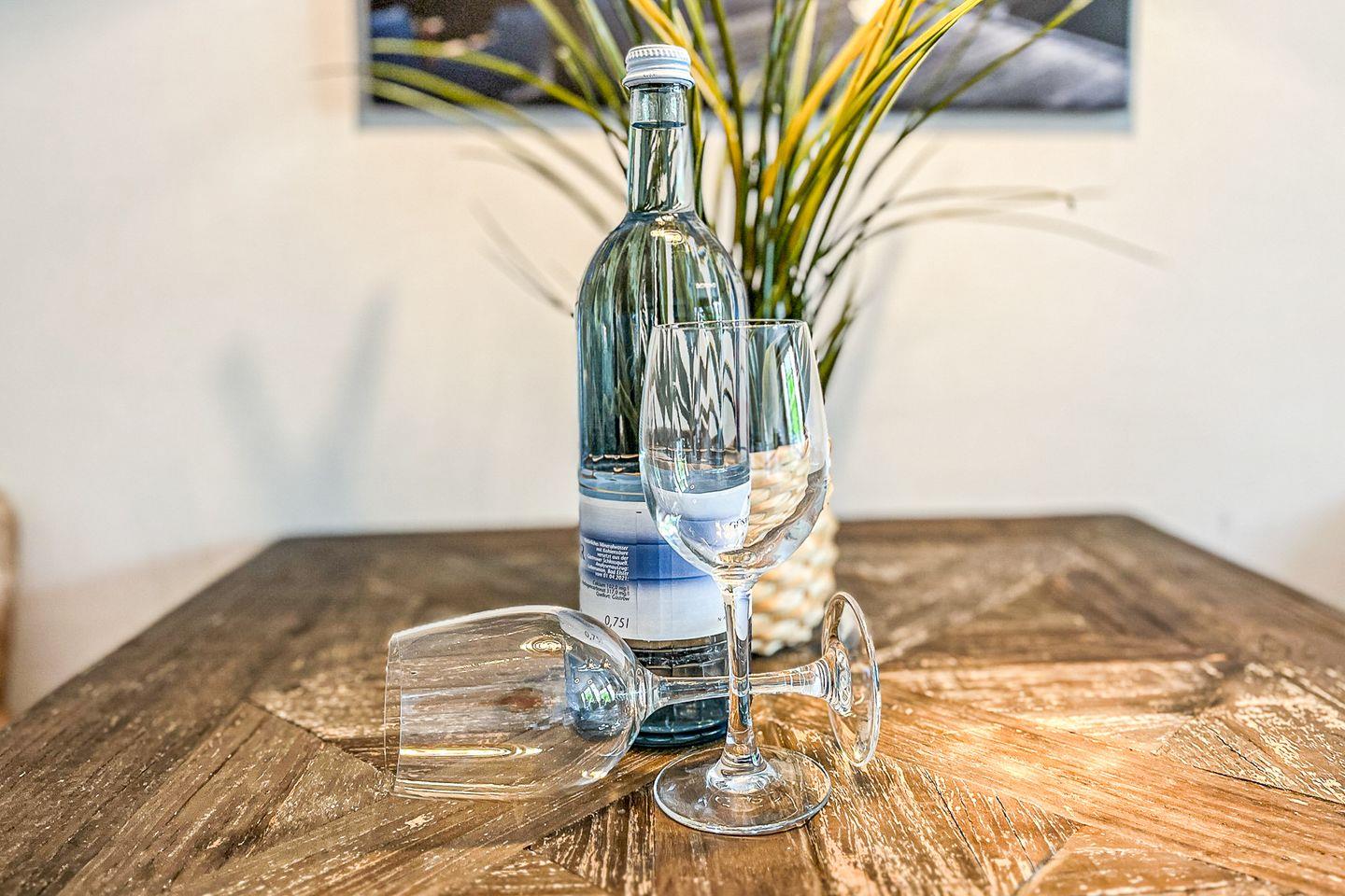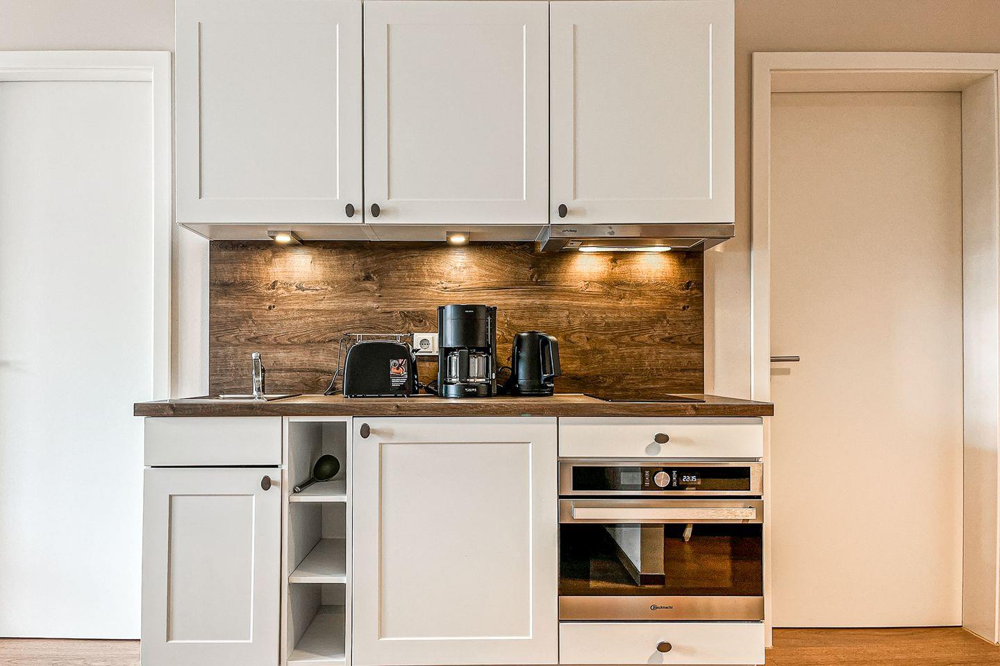Die moderne Küchenzeile ist offen in den Wohnraum integriert und mit allem ausgestattet, was Du für Deinen Aufenthalt benötigst: Cerankochfeld, Kühlschrank mit Gefrierfach, Kaffeemaschine, Wasserkocher, Toaster sowie Kochutensilien und Geschirr.