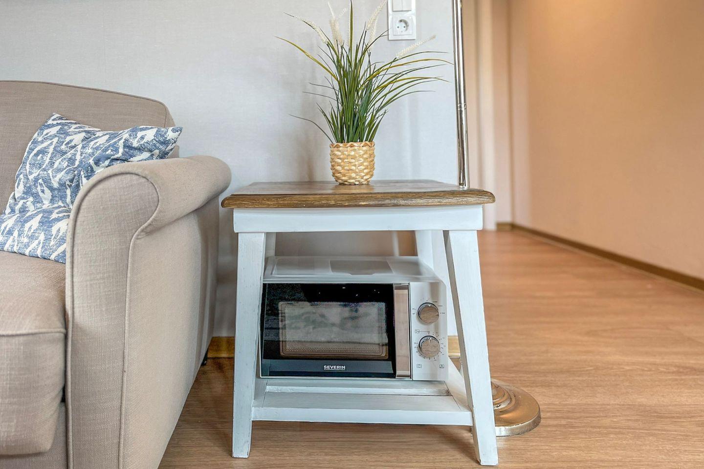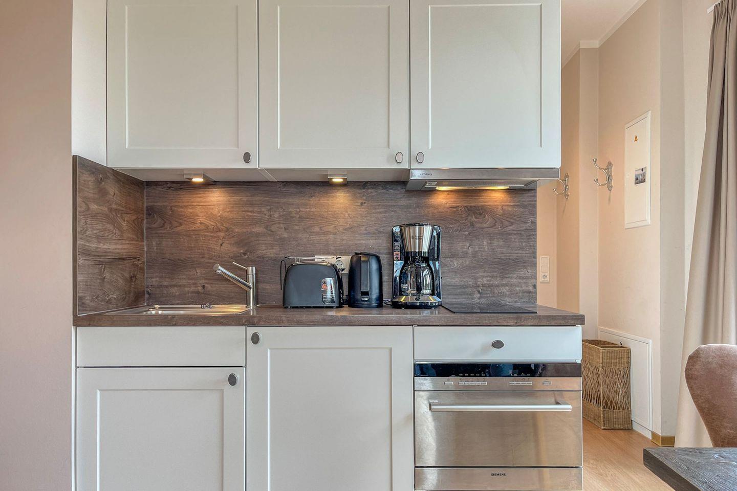 Die Küche ist offen zum Wohnbereich gestaltet und verfügt über eine umfassende Ausstattung: Cerankochfeld, Backofen mit integrierter Mikrowelle, Spülmaschine, Kühlschrank mit Gefrierfach, Kaffeemaschine, Wasserkocher, Toaster, Kochutensilien sowie Geschirr und Besteck – ideal für Deine Selbstverpflegung.