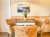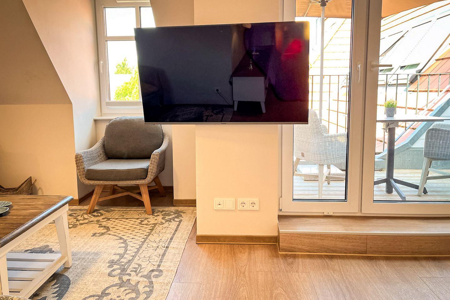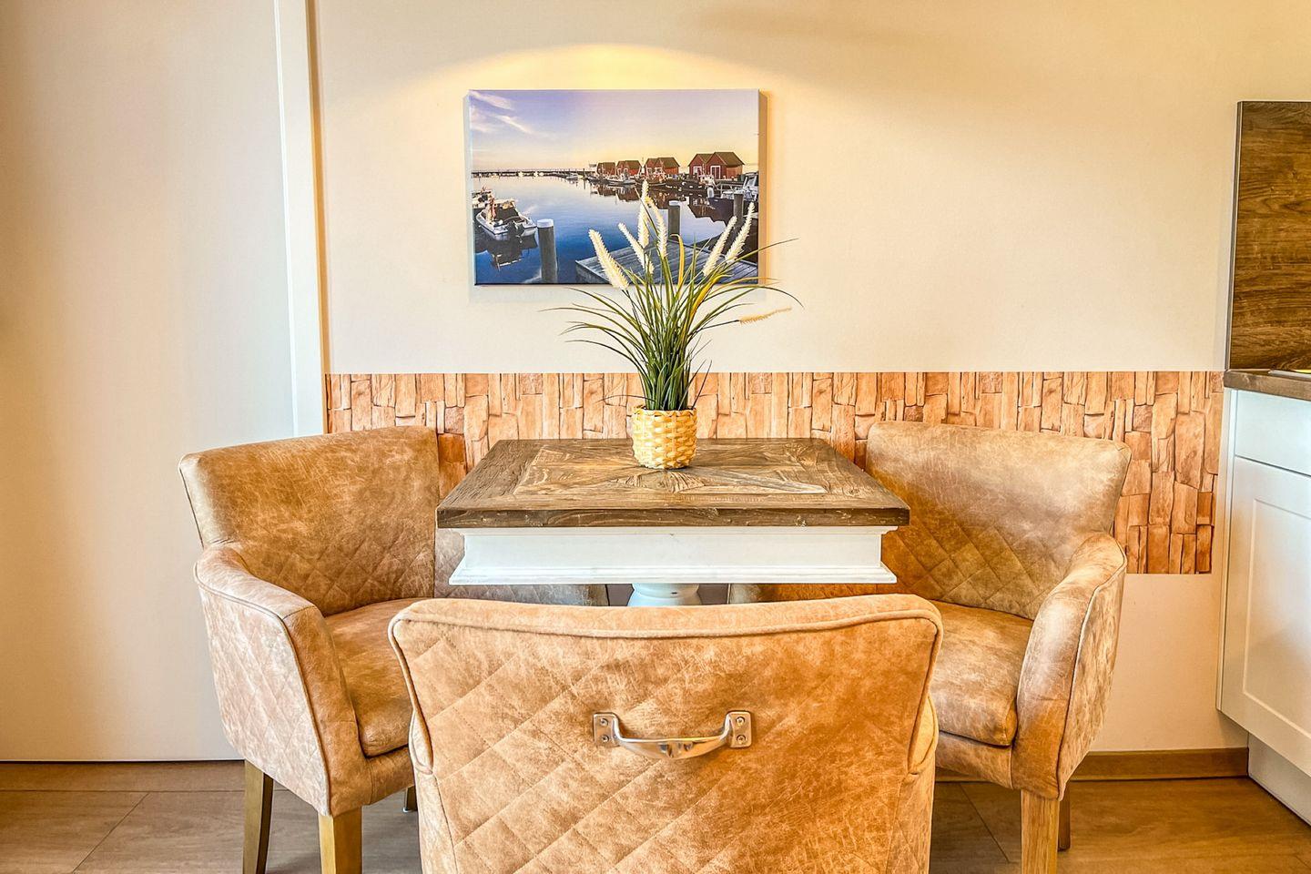 Im Wohnbereich findest Du ein bequemes Sofa sowie zwei Sessel – perfekt zum Entspannen nach einem aktiven Urlaubstag. Ein Flachbild-TV sorgt für unterhaltsame Stunden, während der Essbereich zum gemeinsamen Genießen einlädt.