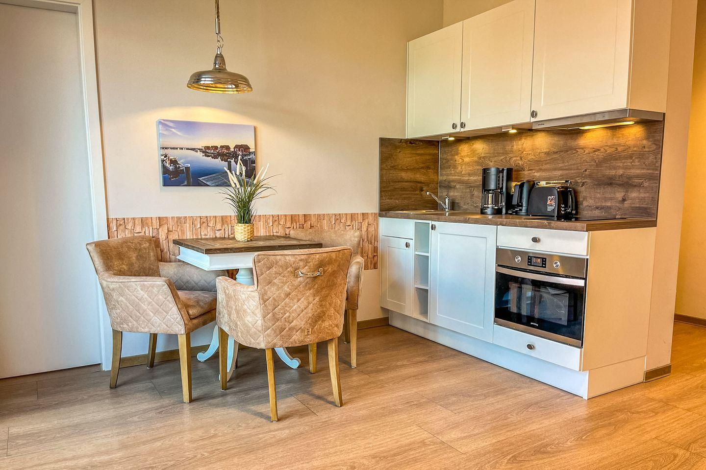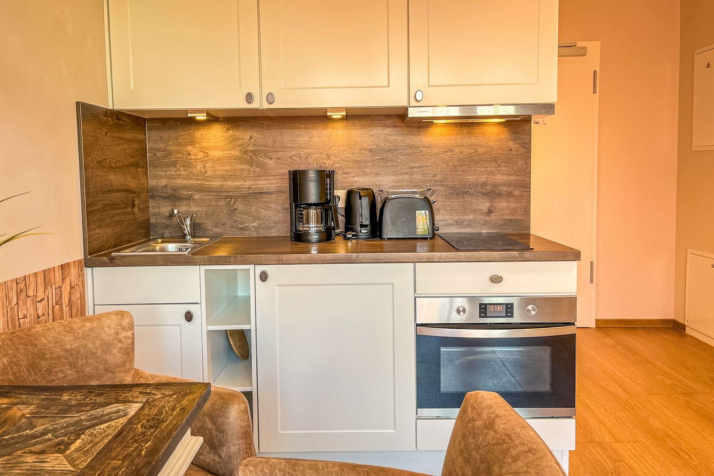 Die offene Küche ist funktional ausgestattet und bietet Dir alles, was Du für die Selbstverpflegung brauchst: Cerankochfeld, Backofen, Kühlschrank mit Gefrierfach, Kaffeemaschine, Wasserkocher, Toaster sowie Kochutensilien und Geschirr.