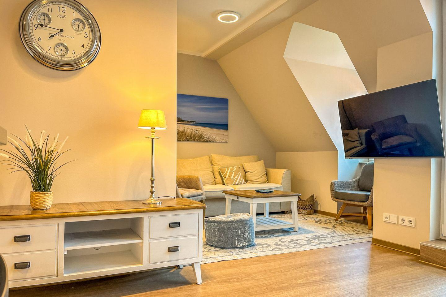 Das stilvolle Apartment im 2. Obergeschoss bietet ca. 52?m² Wohnfläche und überzeugt durch eine gelungene Kombination aus Gemütlichkeit und Komfort – ideal für Paare oder Alleinreisende, die sich nach Ruhe und Ostseenähe sehnen.