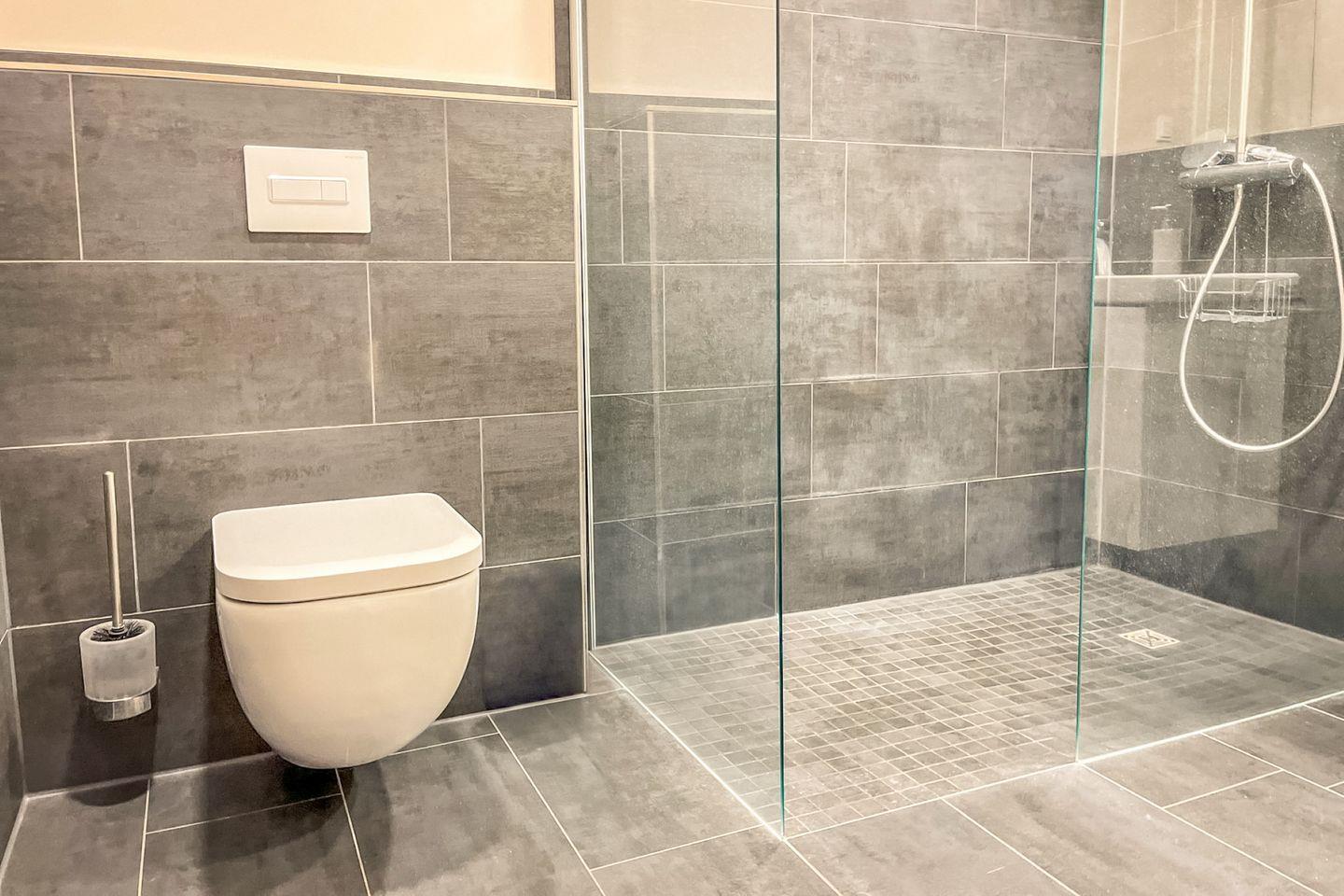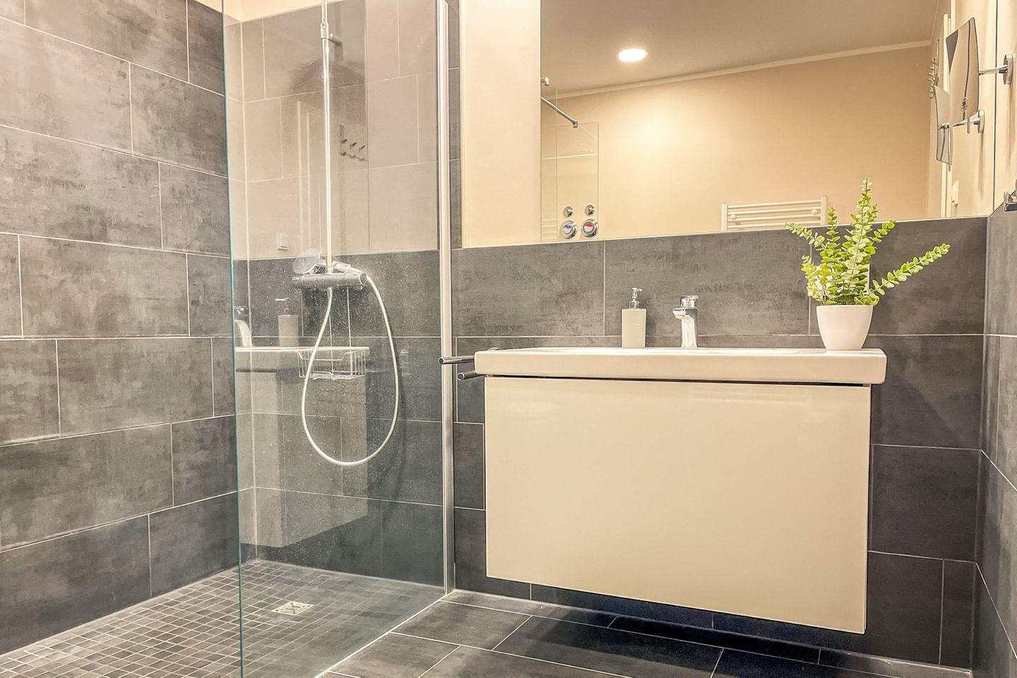 Das Badezimmer ist mit einer bodengleichen Dusche ausgestattet. Weiterhin sind ein WC, Waschbecken, Kosmetikspiegel und ein Haartrockner vorhanden.