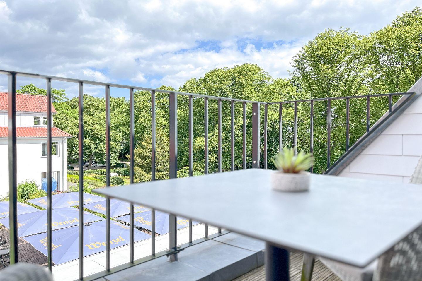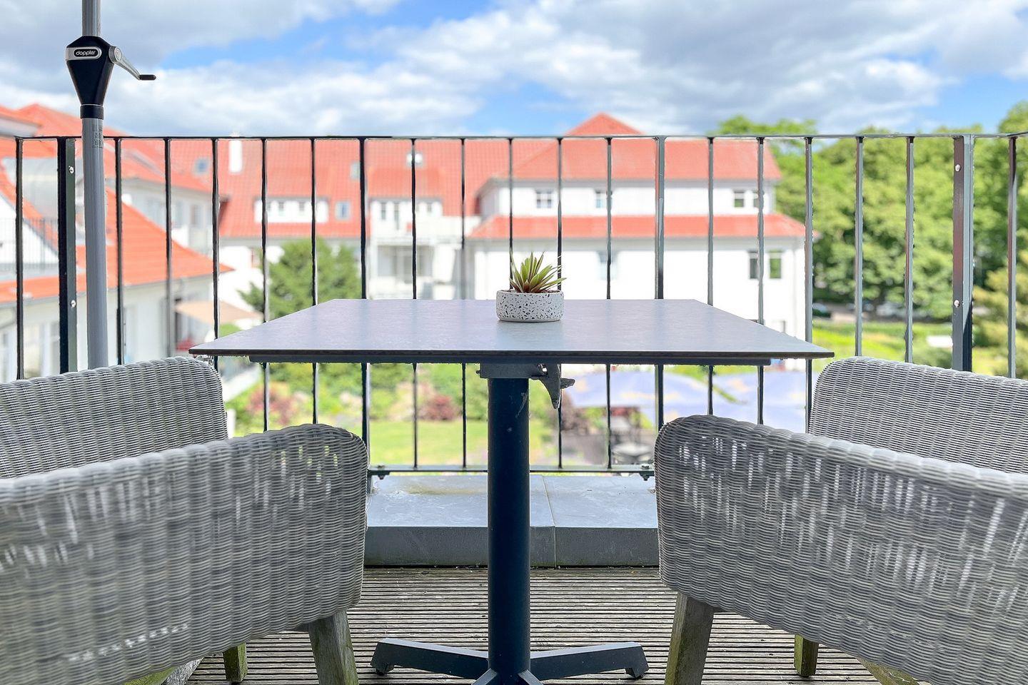 Ein besonderes Highlight ist der möblierte Balkon mit seitlichem Meerblick – genieße Dein Frühstück mit Blick auf die Ostsee oder einen entspannten Abend bei frischer Meeresbrise.