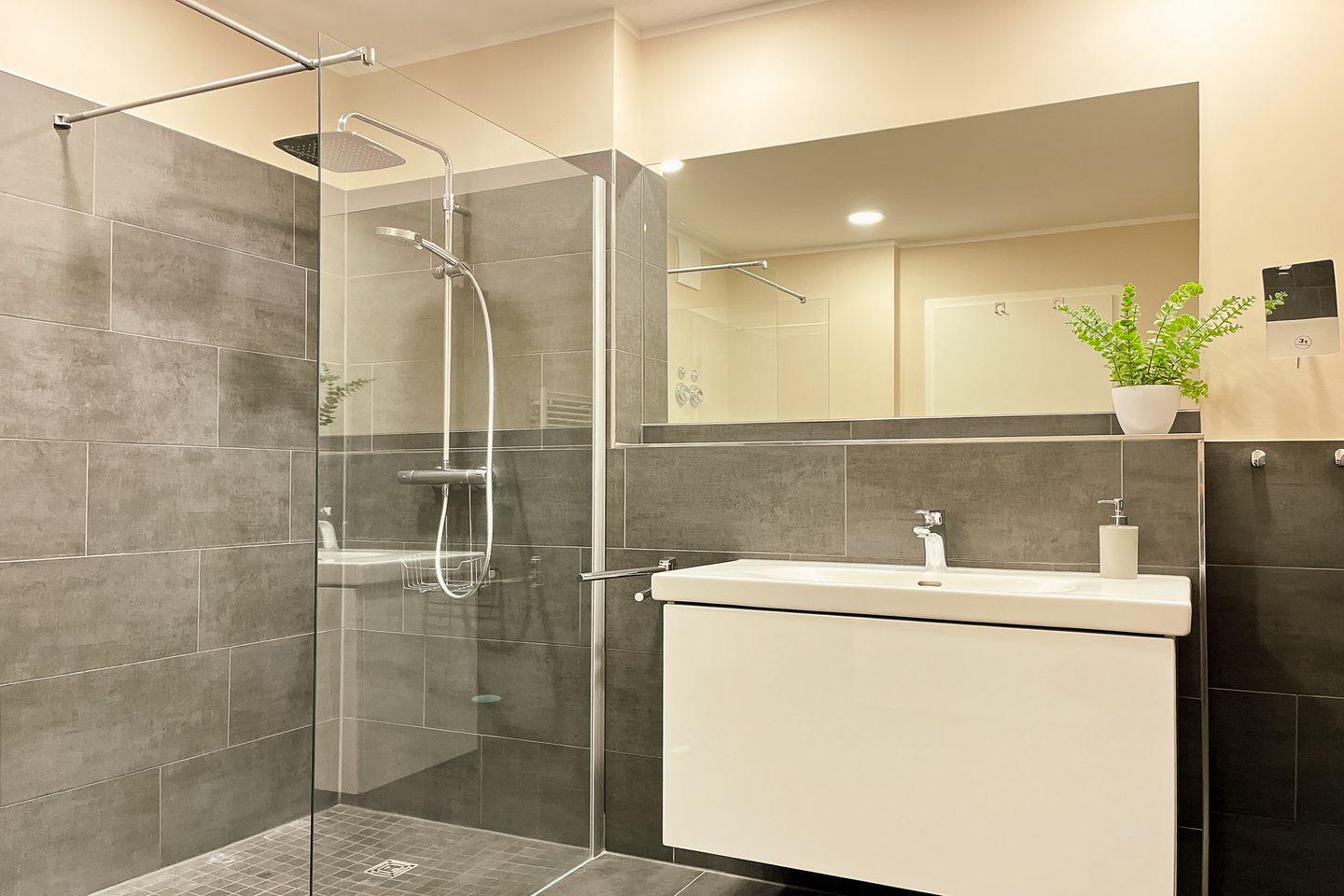 Das Badezimmer überzeugt mit einer bodengleichen Dusche, einem WC, Waschbecken, Kosmetikspiegel und einem Haartrockner.