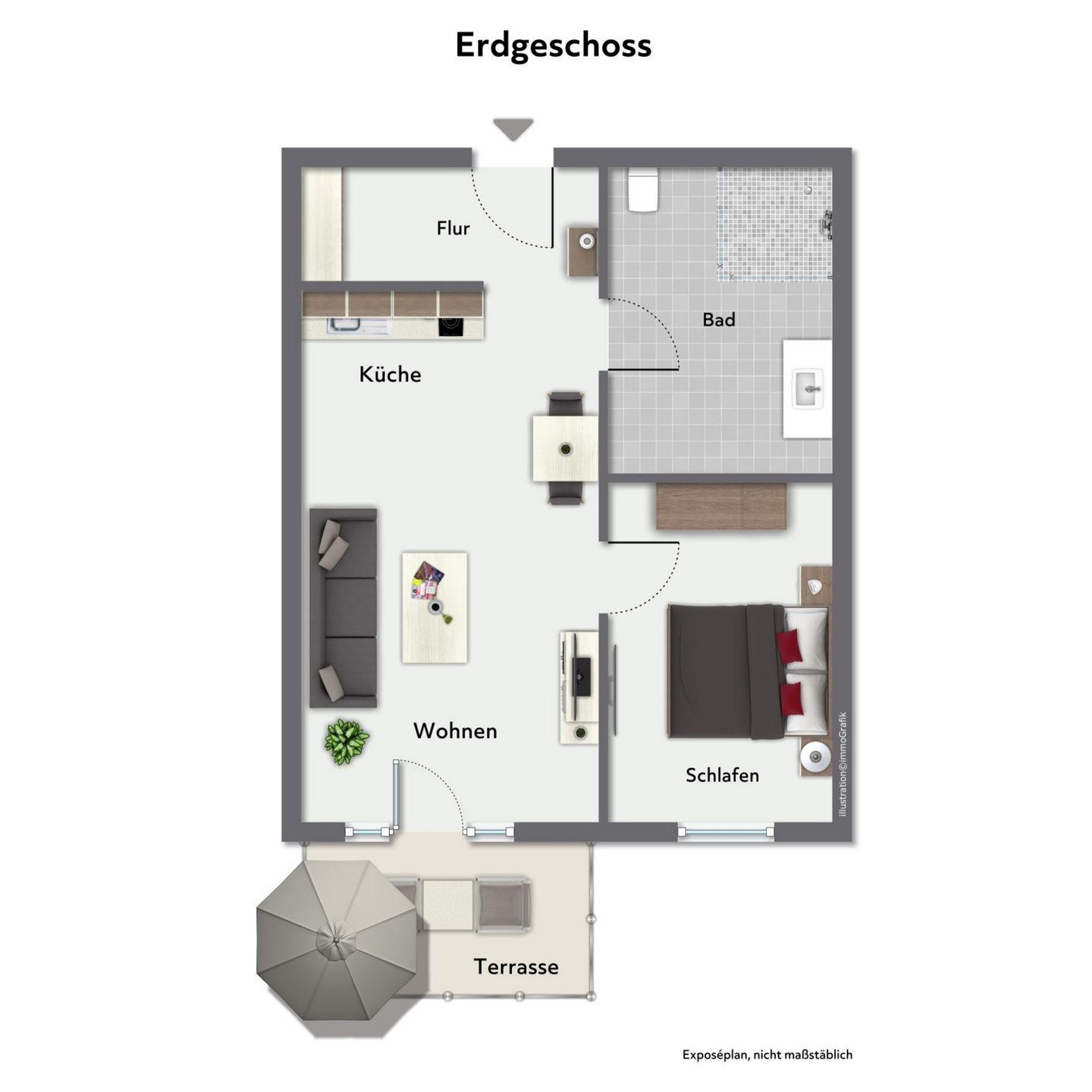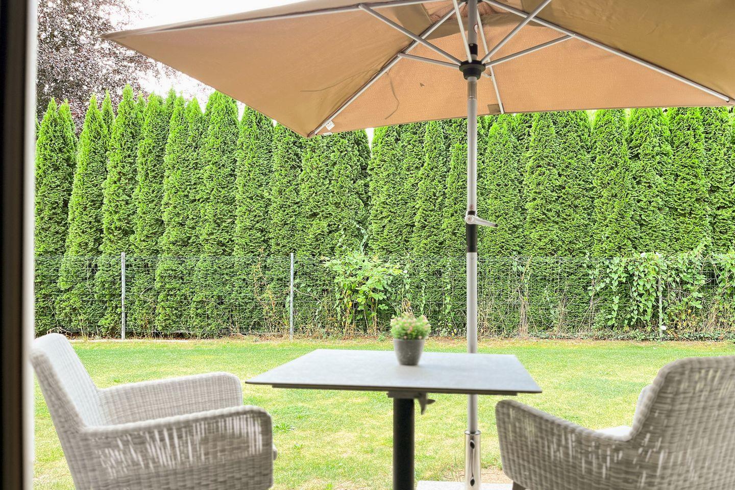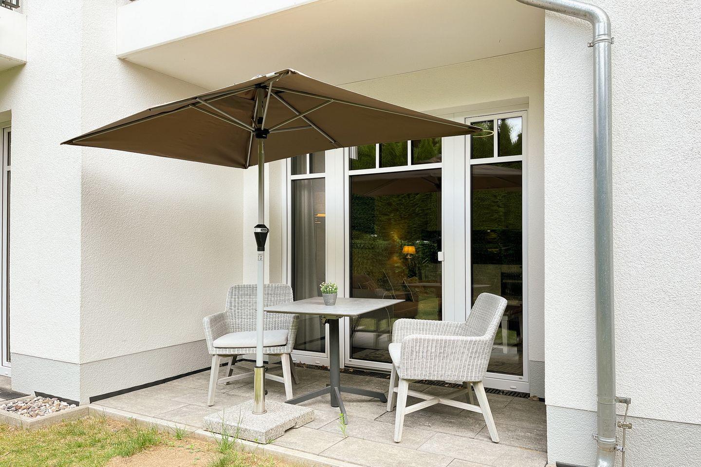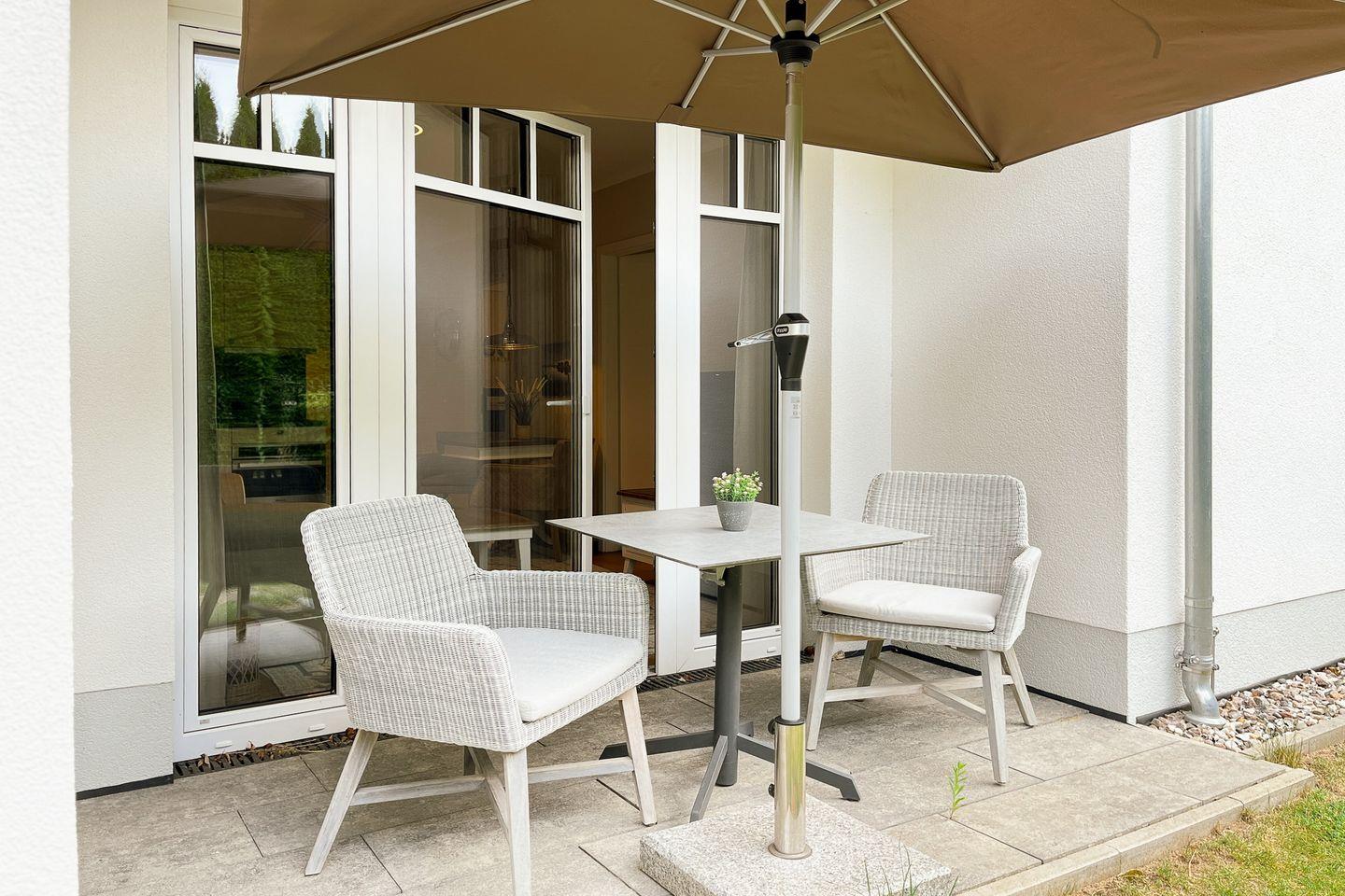 Ein Highlight dieser Wohnung ist die möblierte Terrasse mit Sonnenschirm – perfekt, um die frische Meeresluft zu genießen oder bei einem Kaffee im Freien zu entspannen.