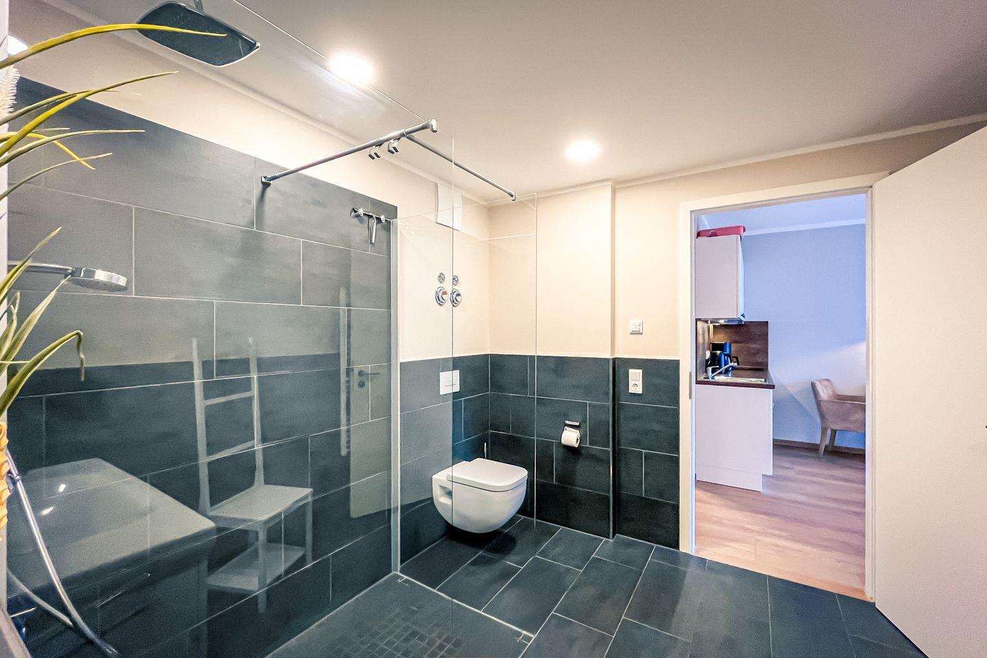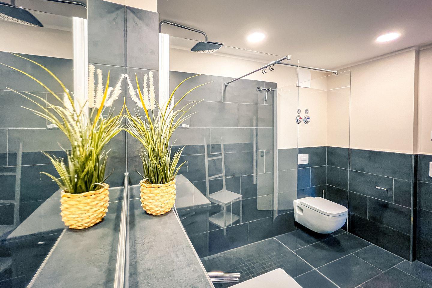 Das Badezimmer ist funktional und hochwertig ausgestattet mit bodengleicher Dusche, WC, Waschbecken, Kosmetikspiegel und Haartrockner.