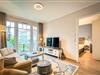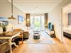Der Wohnbereich lädt mit einem komfortablen Sofa und einem Flachbild-TV zu entspannten Stunden ein. Der Essbereich bietet Platz für zwei Personen und fügt sich harmonisch in das offene Raumkonzept ein.