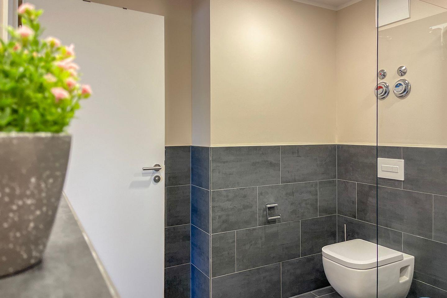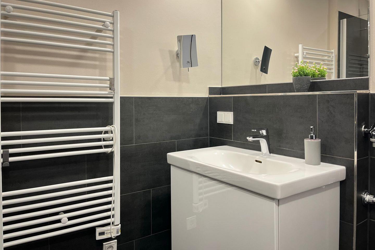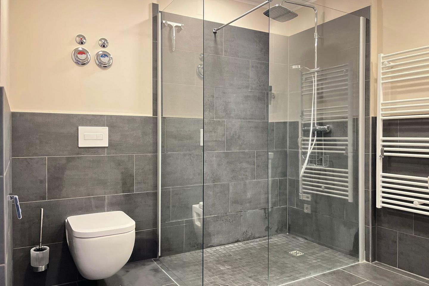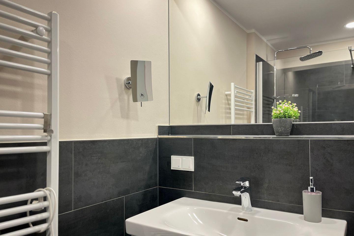 Das Badezimmer ist modern gestaltet und verfügt über eine bodengleiche Dusche, WC, Waschbecken, Kosmetikspiegel und Haartrockner – optimal für einen angenehmen Start in den Tag.