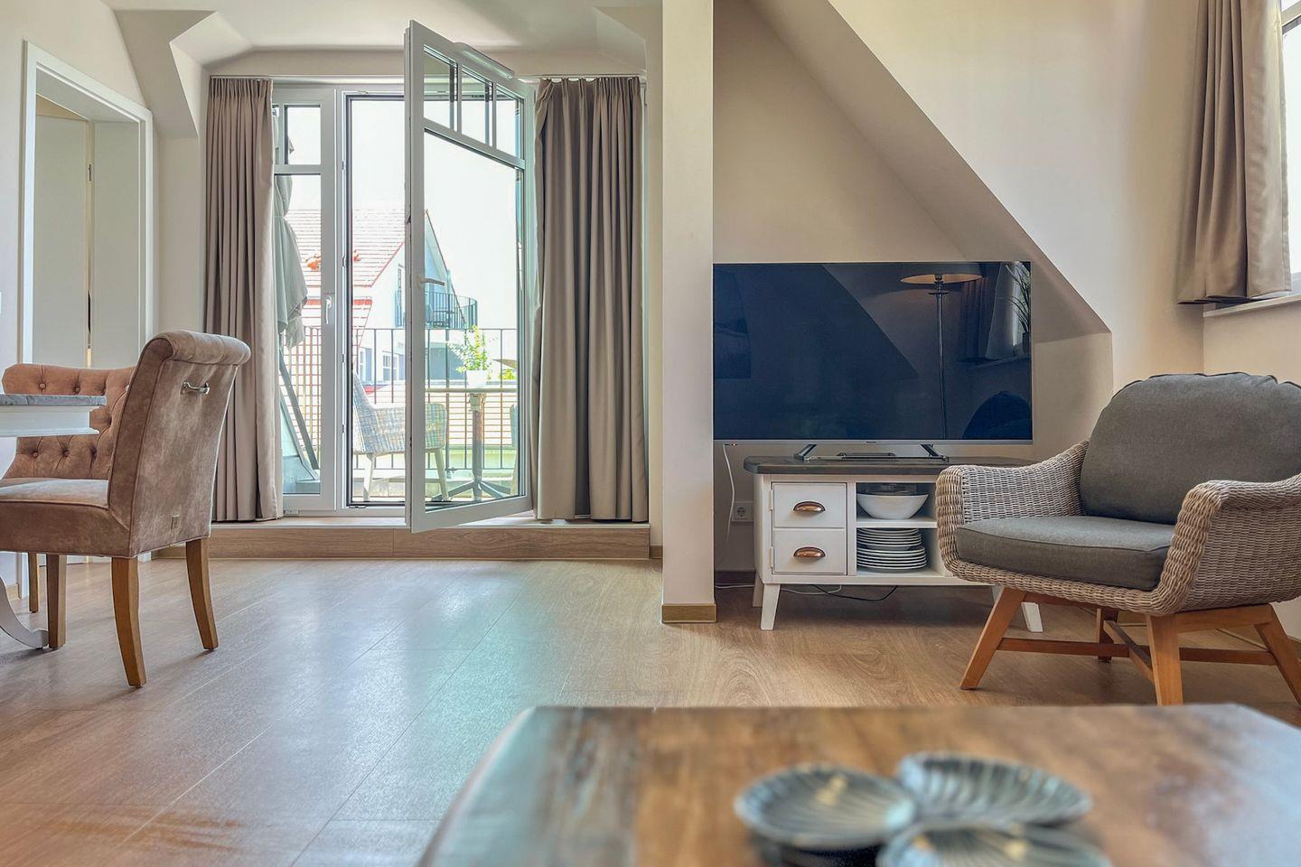 Die Ferienwohnung 58 im Baltischen Hof in Boltenhagen ist eine stilvolle 2-Zimmer-Wohnung für bis zu drei Personen.