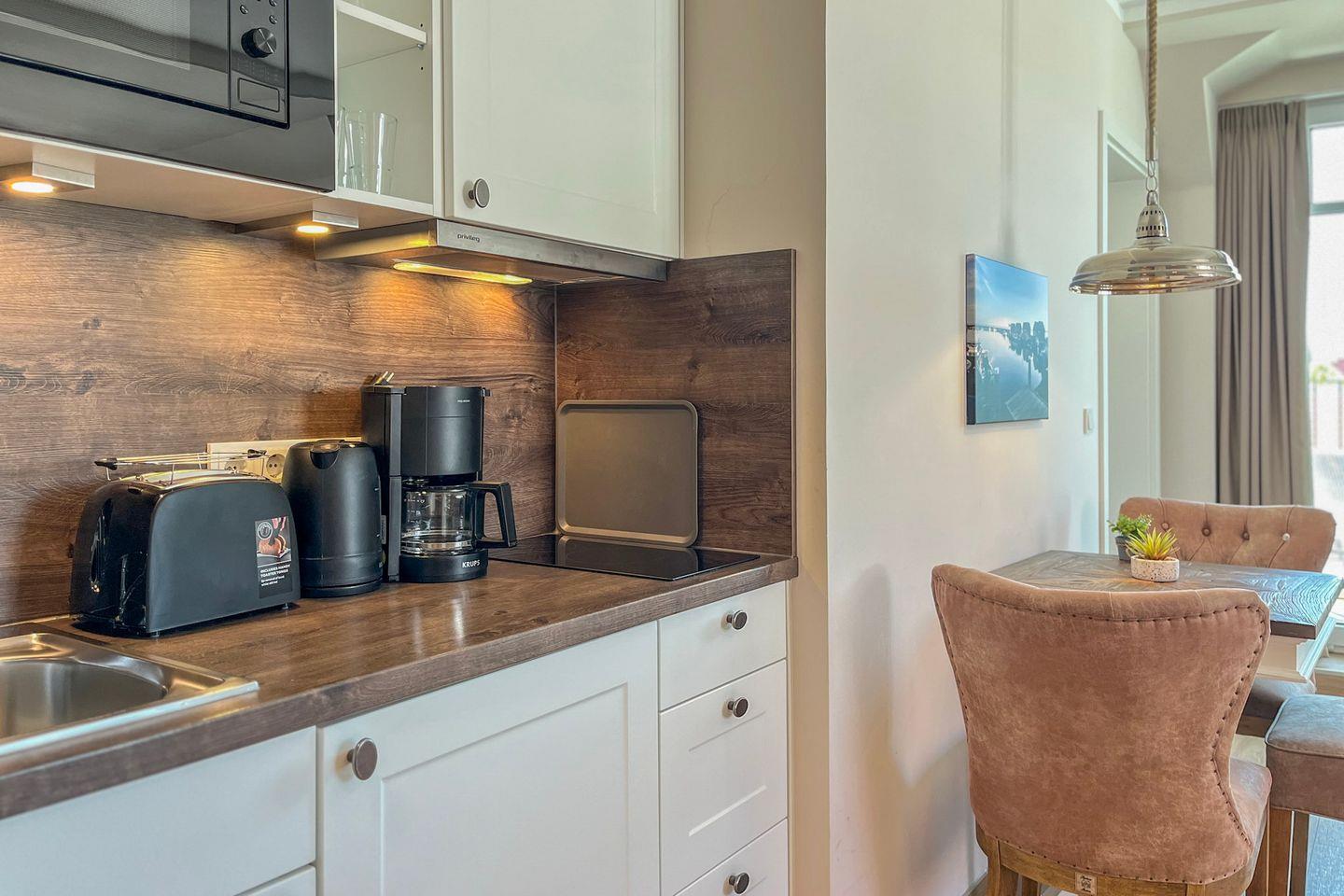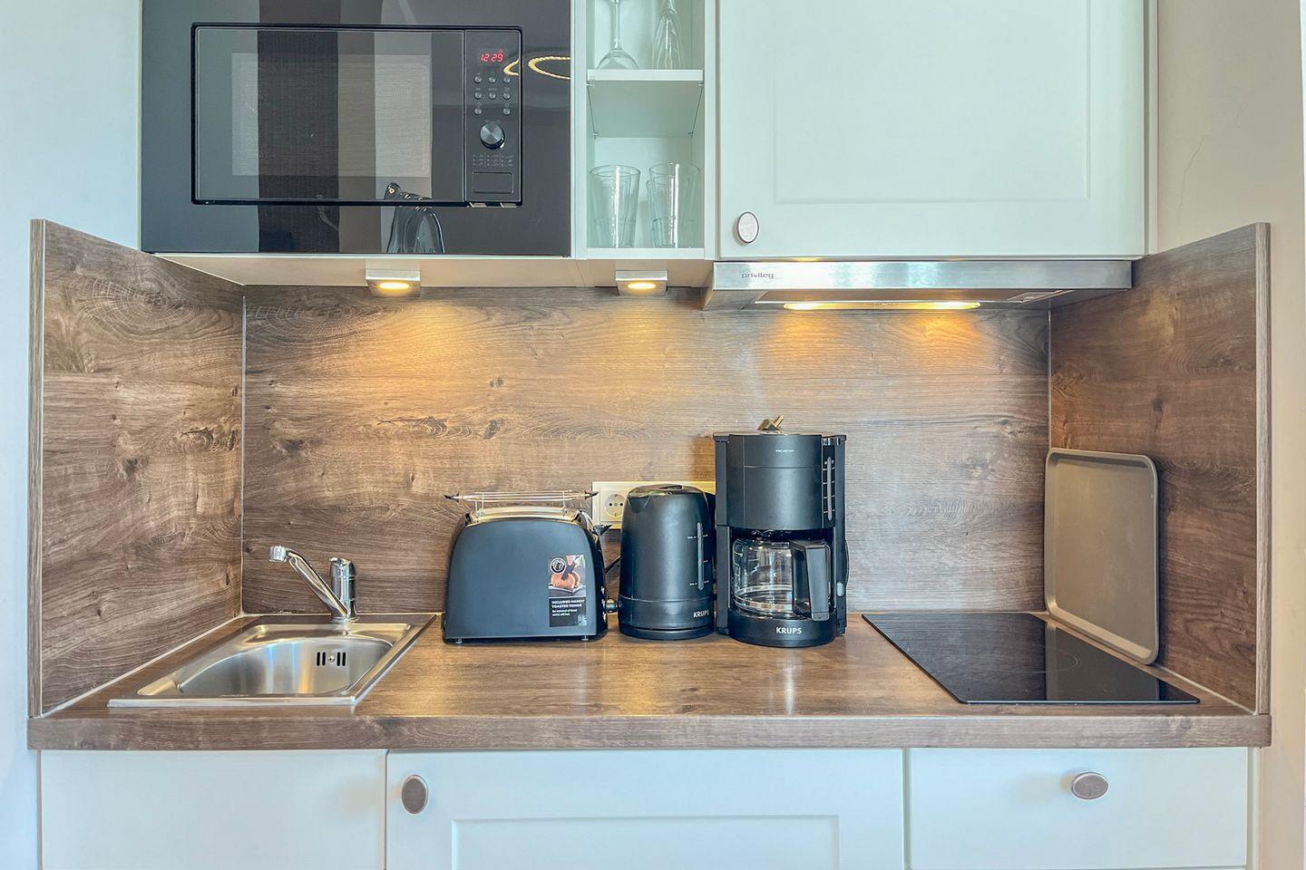 Die offene Küche ist vollständig ausgestattet und lässt keine Wünsche offen: Cerankochfeld, Mikrowelle, Kühlschrank mit Gefrierfach, Kaffeemaschine, Wasserkocher, Toaster, Küchenutensilien sowie Geschirr und Besteck – ideal für Selbstversorger.