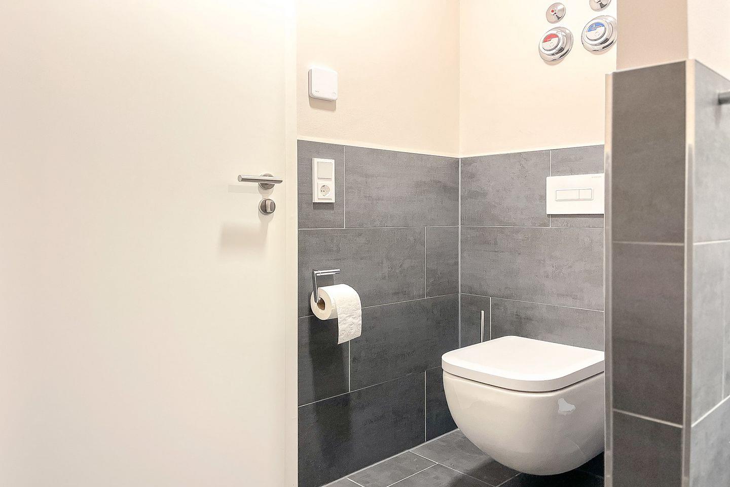 Das moderne Badezimmer verfügt über eine bodengleiche Dusche, WC, Waschbecken, Kosmetikspiegel und Haartrockner – optimal für Deinen Start in den Tag.