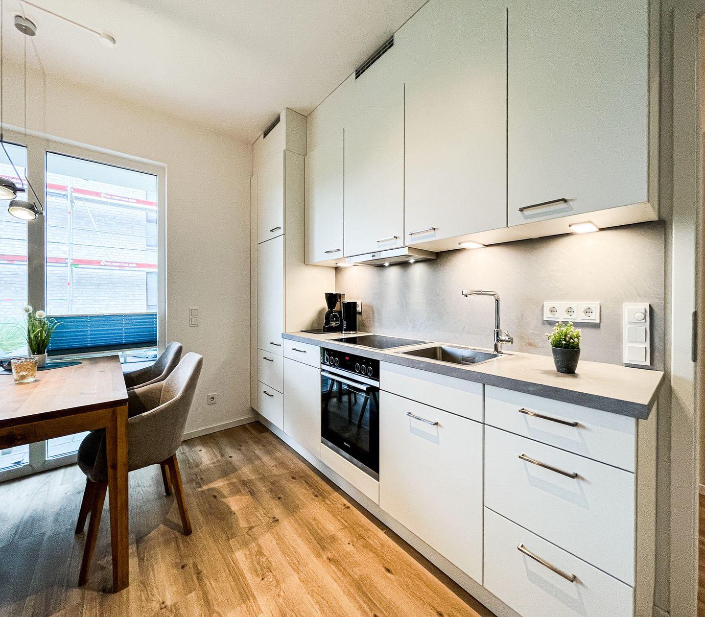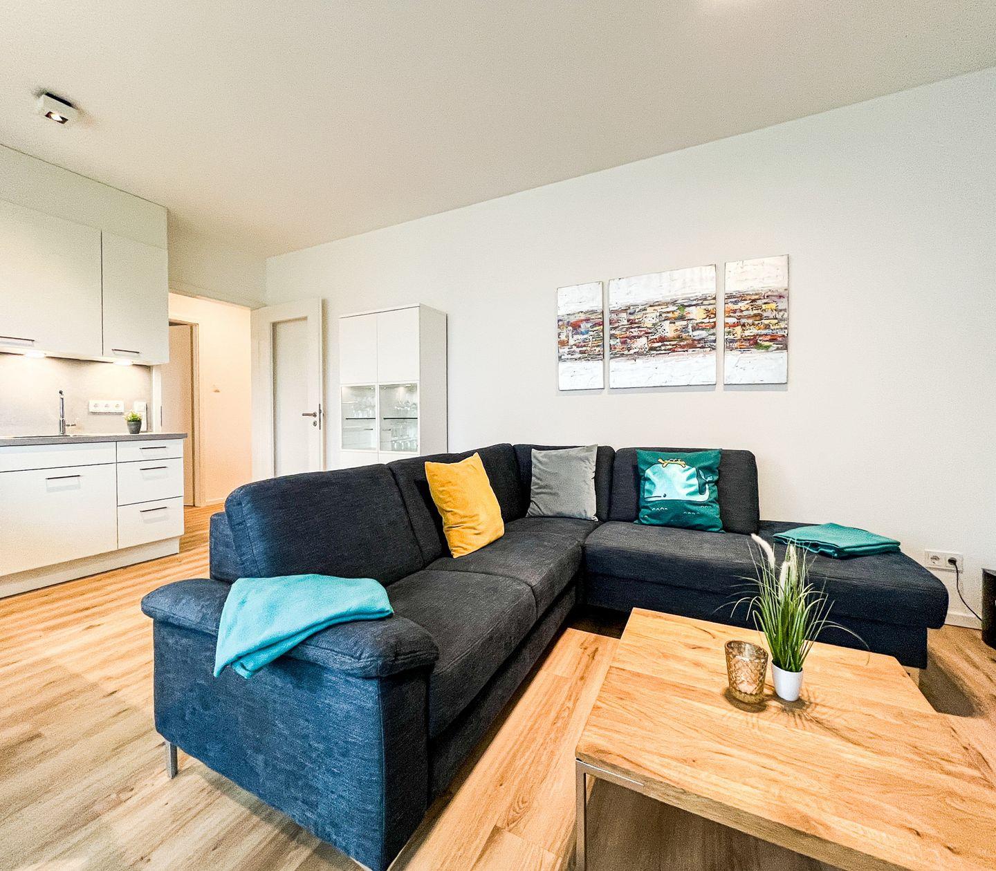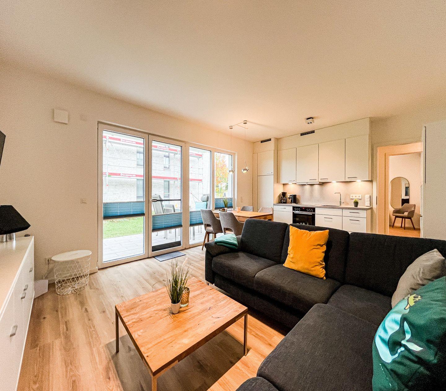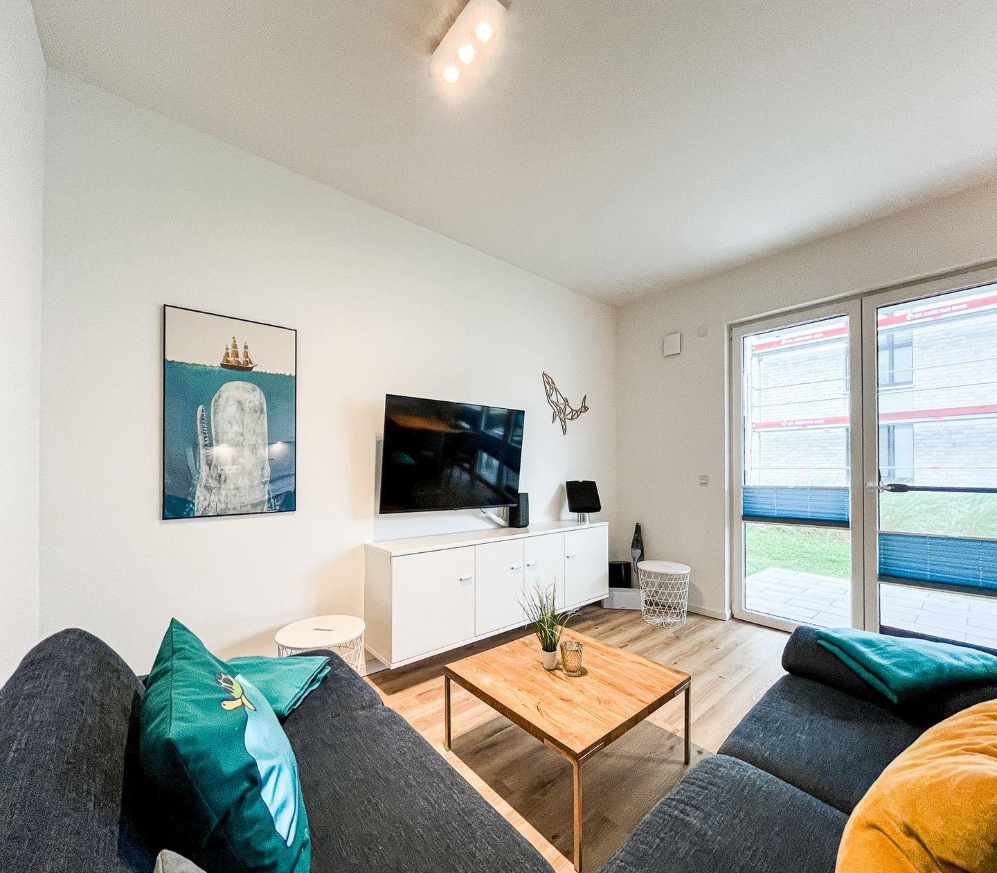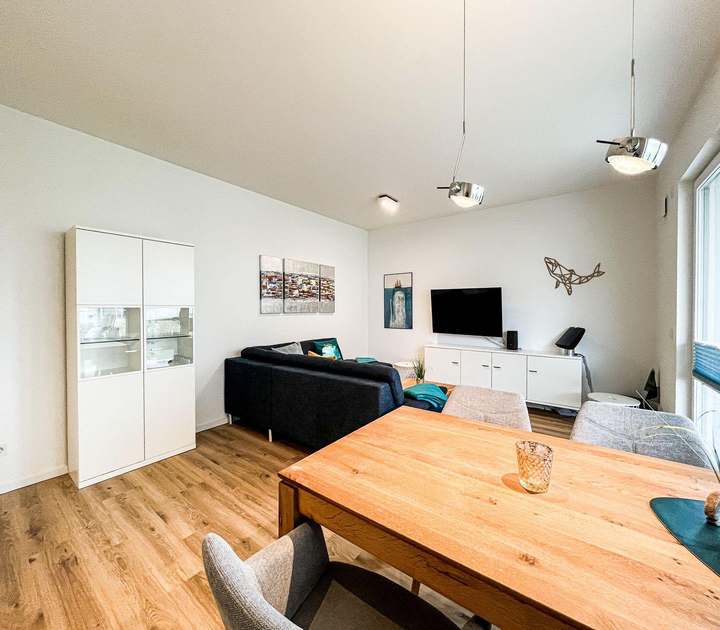 Das lichtdurchflutete Wohnzimmer bildet das Herzstück der Wohnung und ist mit einem gemütlichen Sofa, Sesseln, einer Kommode und einem Essbereich ausgestattet. Moderne Unterhaltungselektronik wie zwei Fernseher, ein Radio und kostenfreies WLAN (ohne Gewähr) sorgen für Abwechslung und Unterhaltung. Die offene Küche, die harmonisch in den Wohnbereich integriert ist, verfügt über einen Ceranherd, einen Backofen, einen Kühlschrank mit integriertem Gefrierfach, eine Spülmaschine, Kaffeemaschine, Wasserkocher, Toaster und vielfältiges Geschirr sowie Besteck. Praktische Utensilien wie ein Staubsauger, ein Wäscheständer und eine Waschmaschine zur Eigennutzung ergänzen den hohen Wohnkomfort.